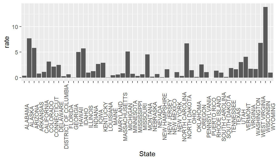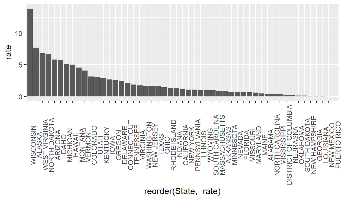 ggplot(aes(x = reorder(State, -rate), y = rate)) +