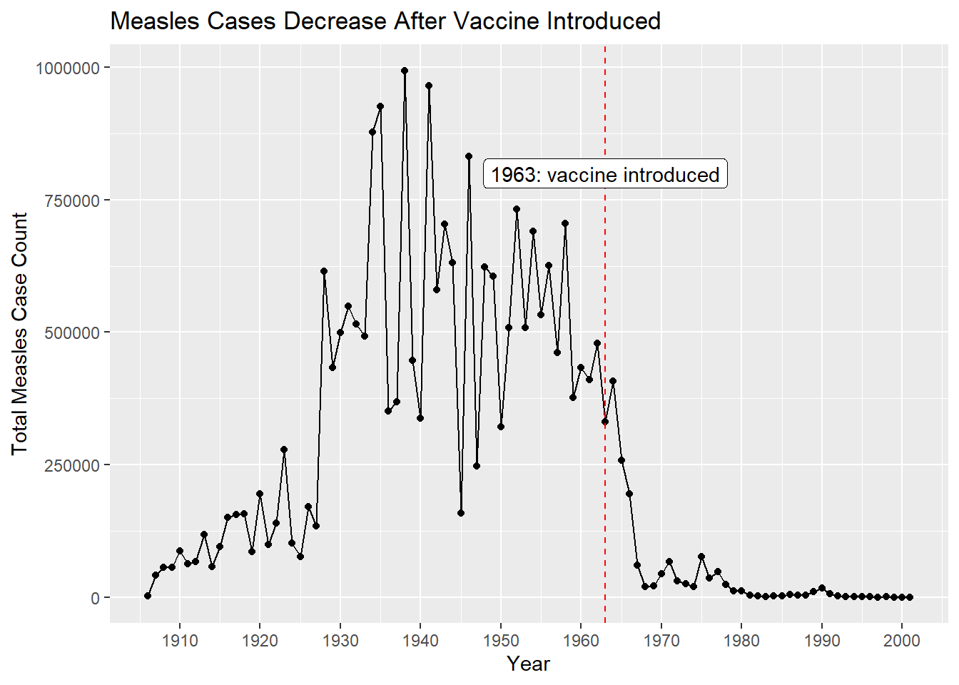 Throughout this lesson, we will be using a dataset from Project Tycho featuring historical counts of measles cases in the U.S.. We want to clean and present this data in a way that makes it easy to see how measles cases fluctuated over time.