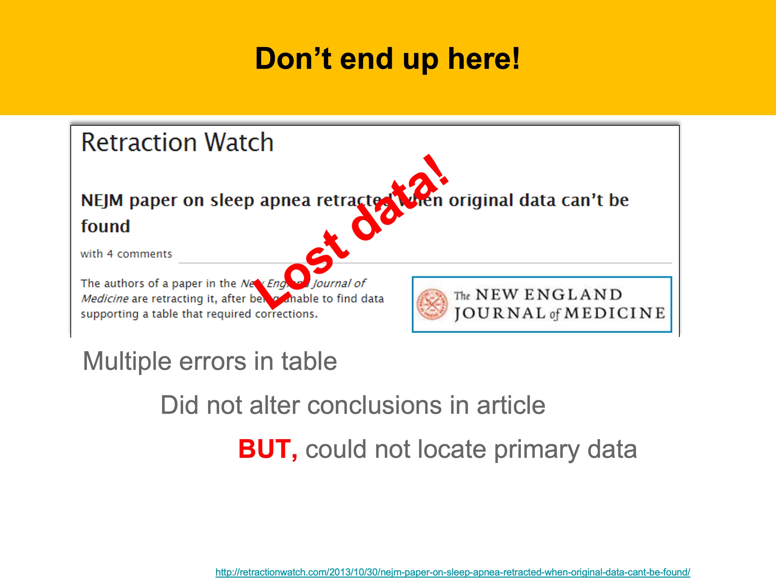 One risk of poor data management, aside from not getting your study published in the first place, is retraction of an article.Retractions are not always caused by deliberate falsification of data.