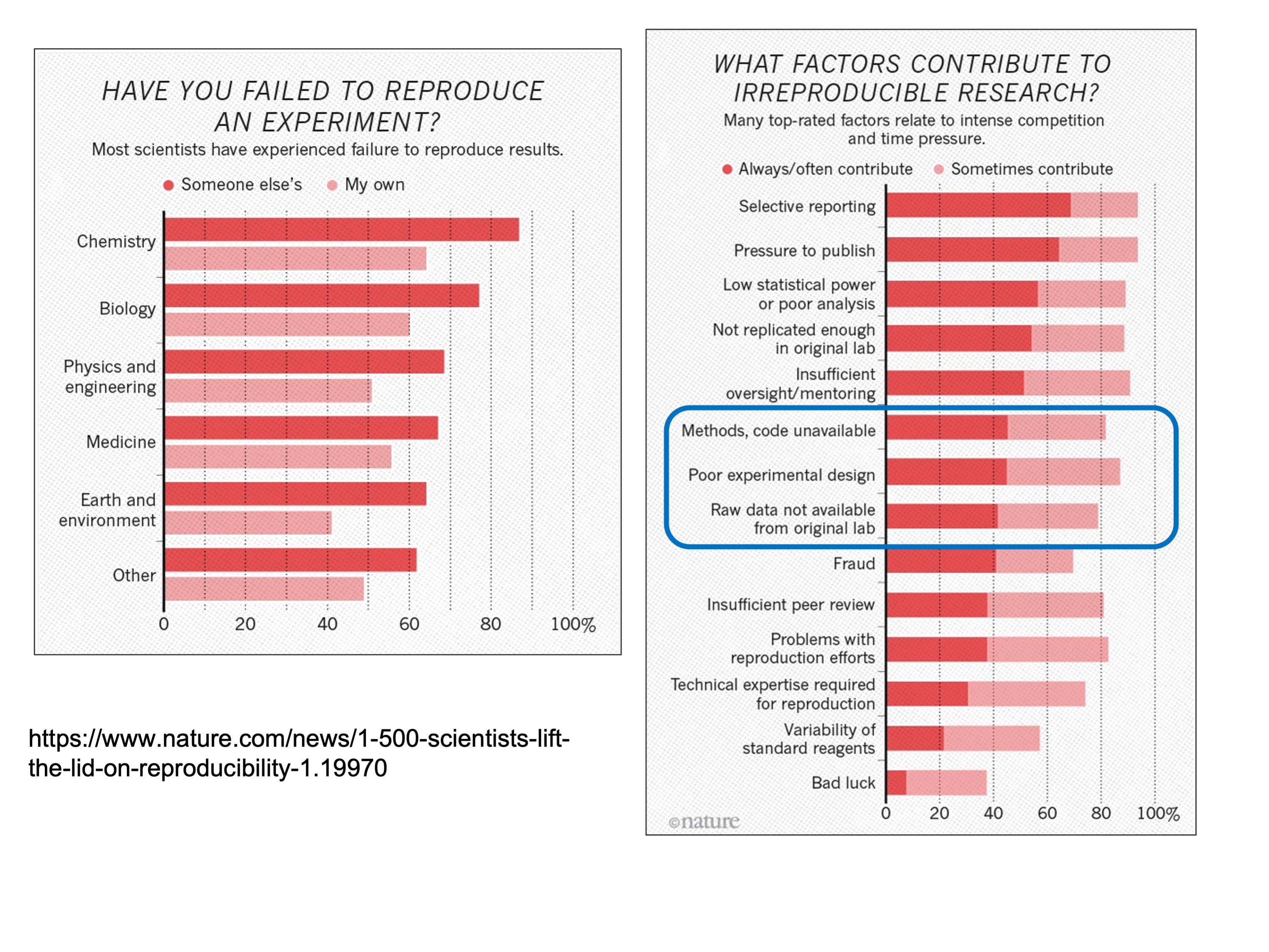I mentioned reproducibility, so let’s talk about that for a minute. Many of you are probably familiar with this Nature survey of over 1500 researchers which found that over 70% of respondents have failed to reproduce another scientist’s experiments and more than half have failed to reproduce their own. The highlighted section on right hand side shows that a number of survey respondents cited data management related issues as contributing to difficulties reproducing research such as unavailability of methods, code, and raw data.