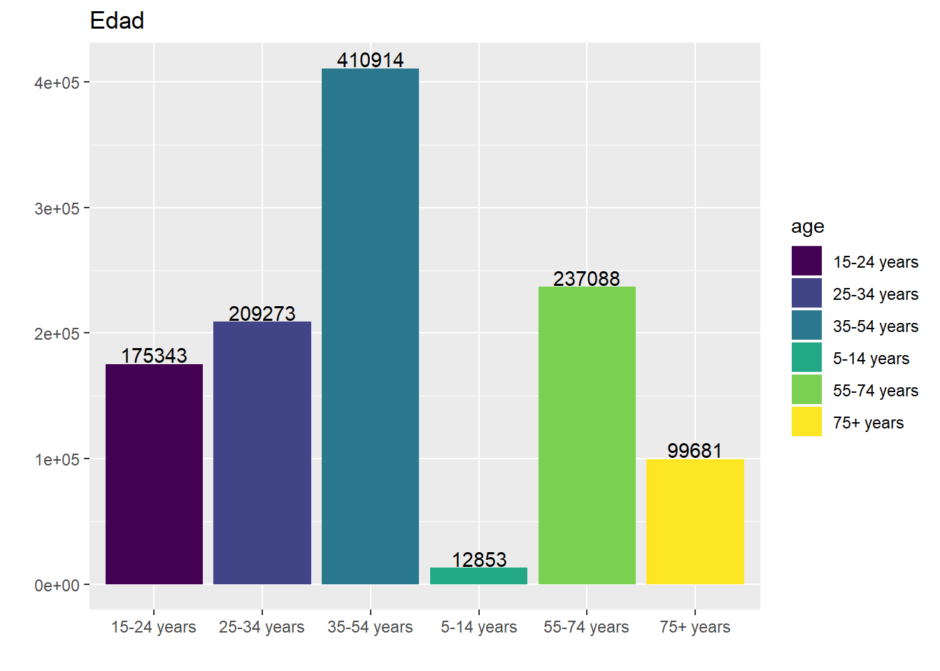Tomando en cuenta la población expuesta podemos ver que tiene casi el mismo comportamiento mencionado anteriormente, se incrementa conforme avanza la edad sólo que en este caso las tasas de 35-54 y 55-74 son muy parecidas. Además, aquí no disminuye la tasa en las edades más avanzadas pues es en 75+ donde alcanza el valor más grande.