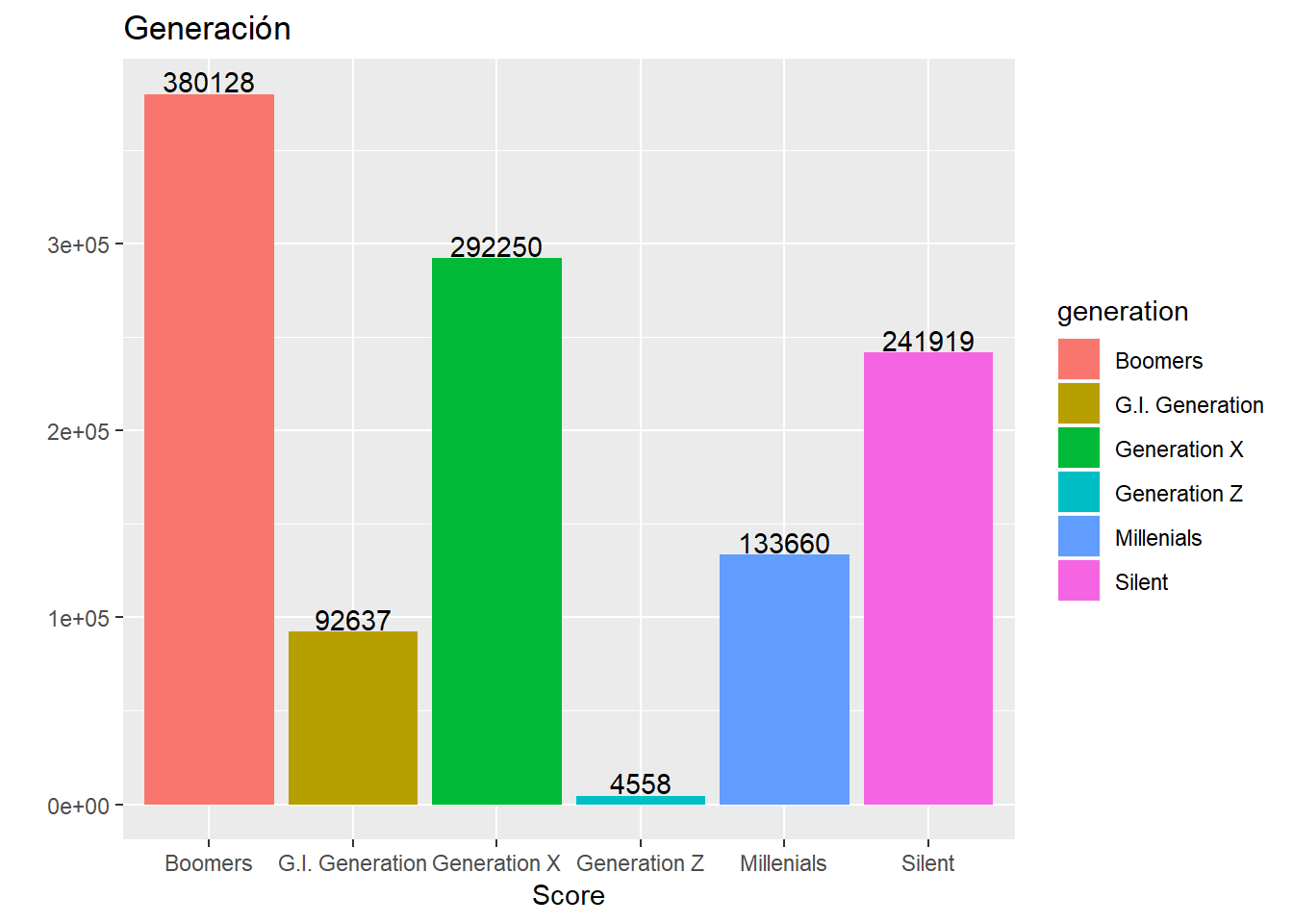 Para la generación Baby Boomer se ha registrado el mayor número de suicidios, esto se puede deber a que es la generación más “grande” en cuanto a número y la Generación Z es la que presenta el menor número de suicidios, esto se debe a que en esta base, con corte a 2015, esta generación no ha vivido mucho.