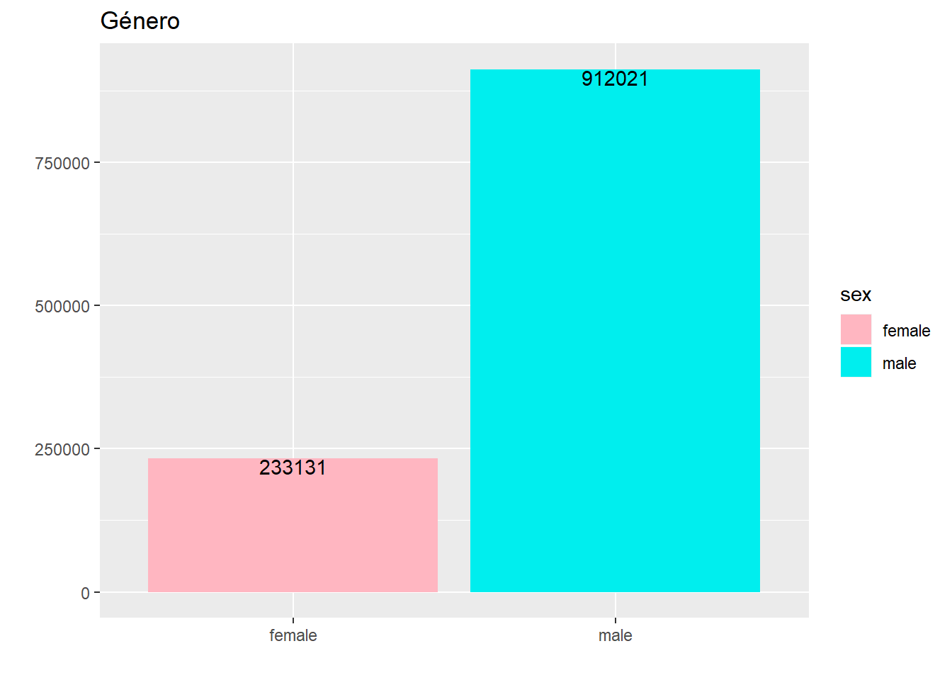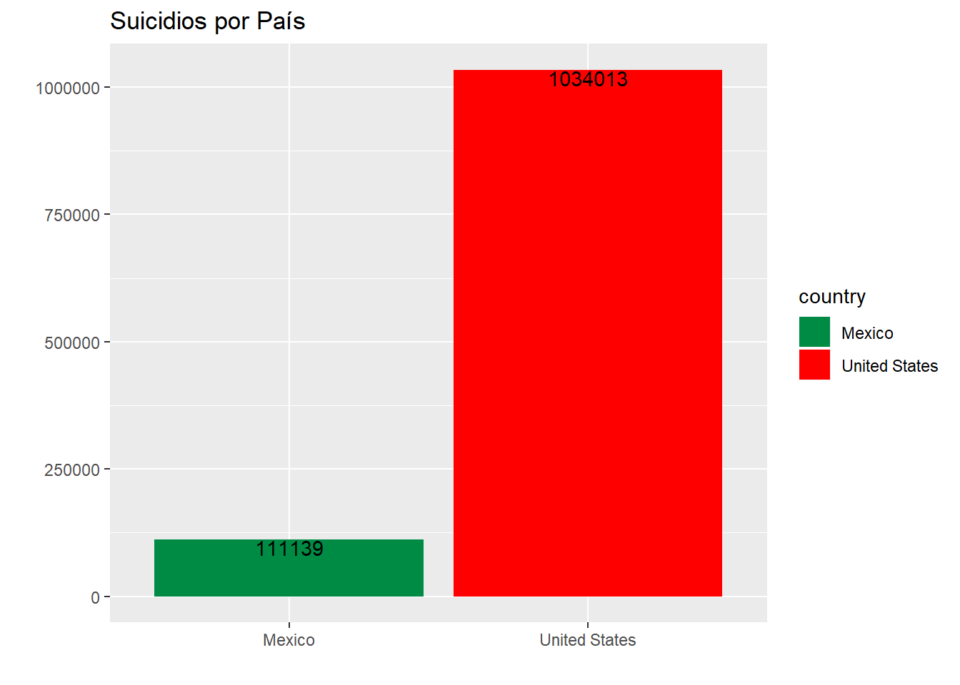 Comencemos con la variable país, en esta primer gráfica podemos ver que en Estados Unidos se han suicidado 1,034,013 sujetos, poco más de 9 veces las personas que se han suicidado en México que son 111,139. Esto puede no decirnos mucho pues sabemos que es importante considerar el número de sujetos expuestos en cada país.