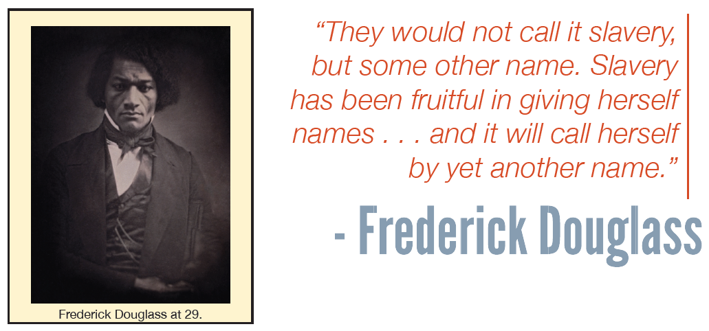 Frederick Douglass, a former slave and leader of the abolitionist movement, wrote - “They would not call it slavery, but some other name. Slavery has been fruitful in giving herself names … and it will call itself by yet another name.” 6