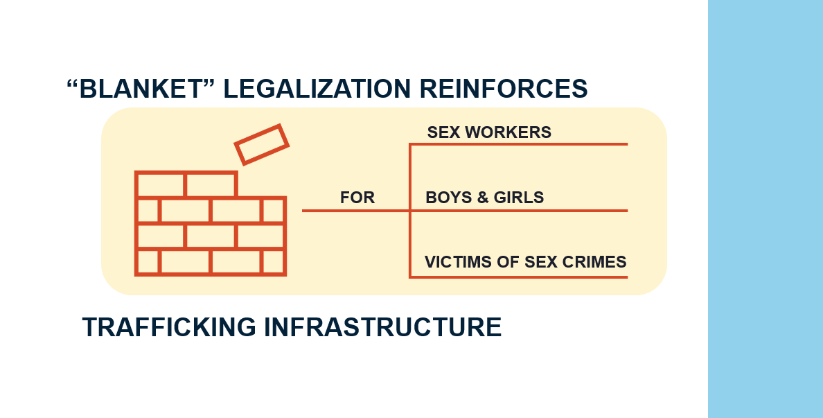 FACT: “Blanket” legalization of prostitution fails to protect sex workers, boys and girls, and to reduce the prevalence of sex crimes. Further, it creates a legalized market for traffickers to bring their victims.