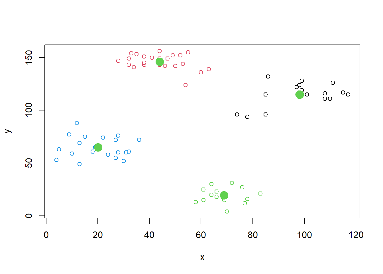 k <- kmeans(ruspini, centers = 4) # Creamos 4 clusters (podemos optar por otra cantidad)