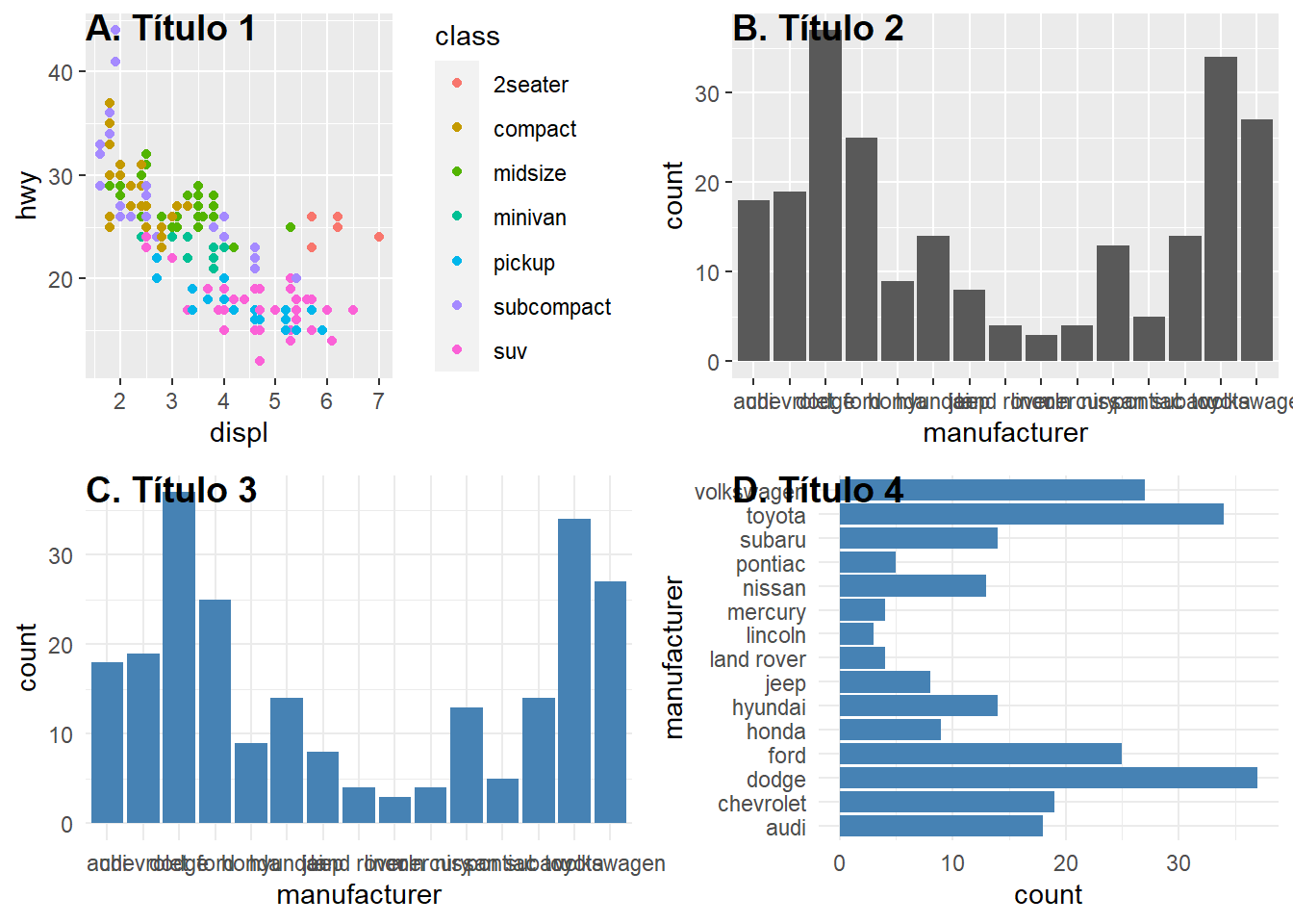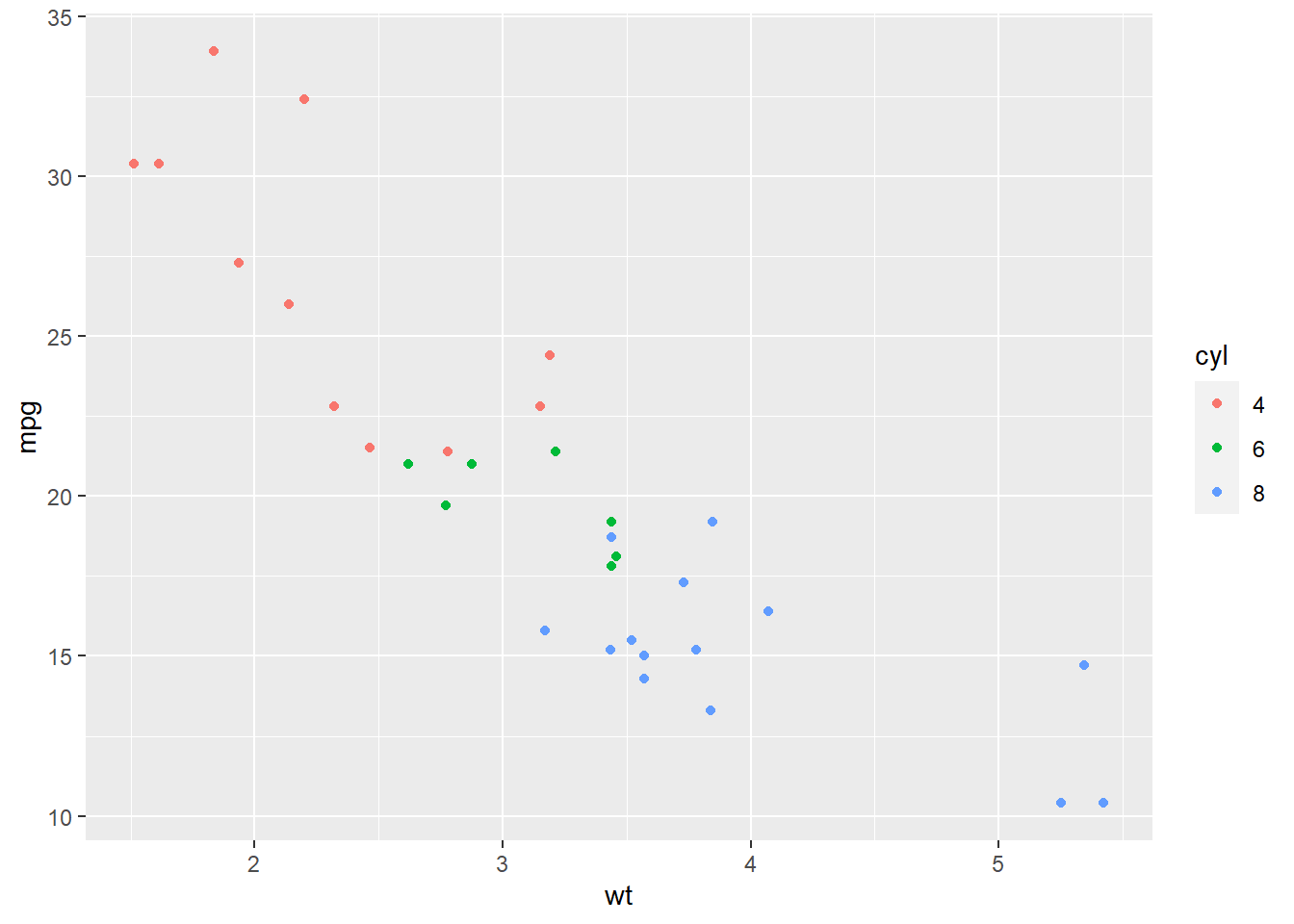 mtcars$cyl <- as.factor(mtcars$cyl)Ahora ya puedes crear el código para replicar los gráficos que encontrarás a continuación con el paquete ggplot2. Añade los títulos y las etiquetas de los ejes a cada gráfico.