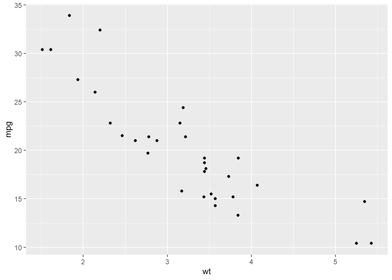 - Gráfico de dispersión indicando, en el eje horizontal, el peso del vehículo (wt = weight) y, en el eje vertical, el consumo de gasolina (mpg = miles per gallon).