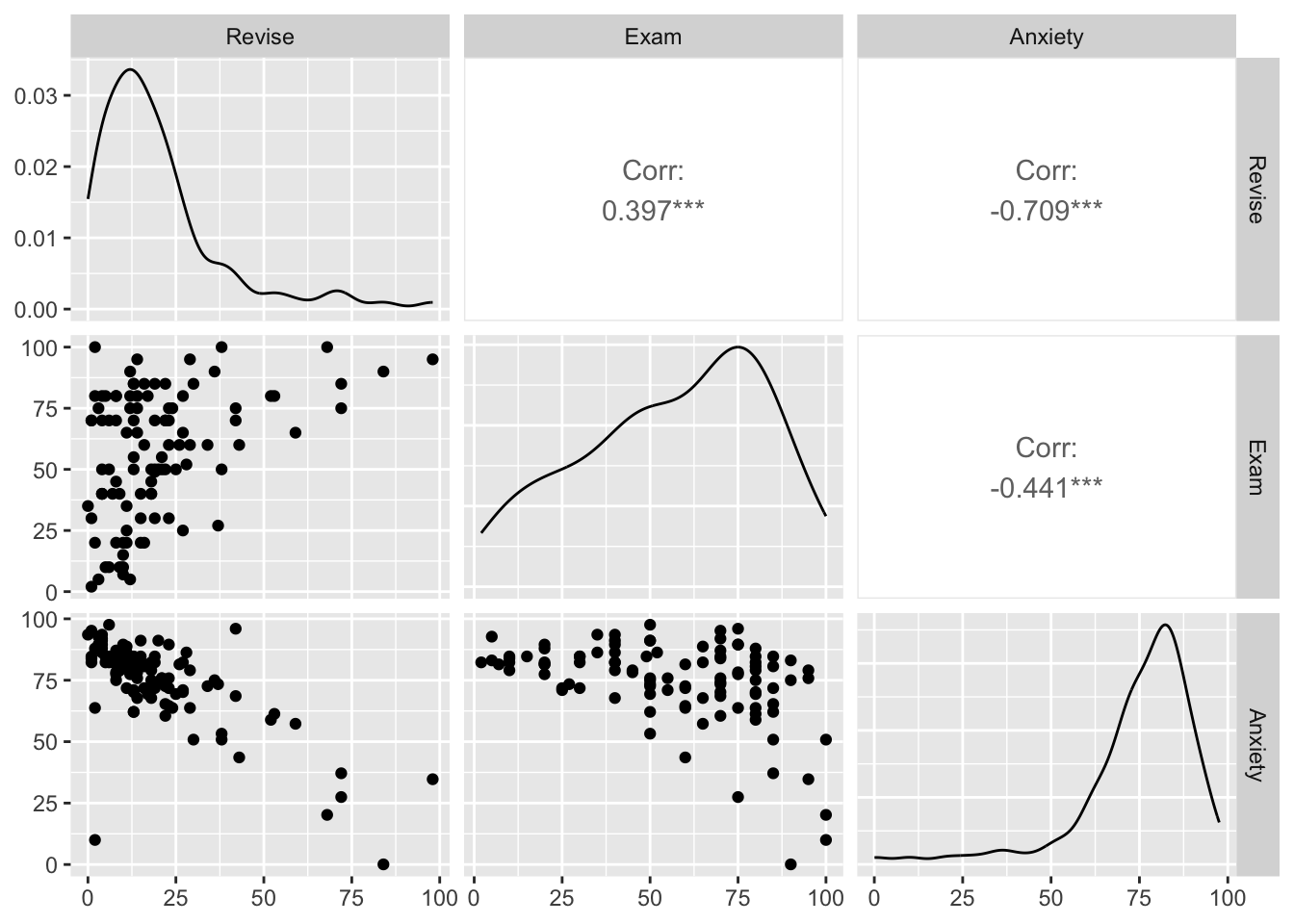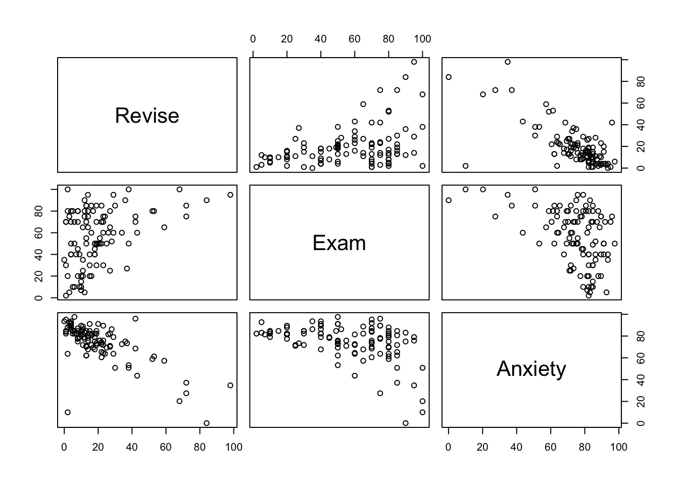 This creates a scatterplot for all of the columns we specify. It may take a while to get used to reading this, but the way to read these is where the names would intersect is the scatterplot that represents those two variables. For example, the exam vs revise scatterplot would be the top middle scatterplot.