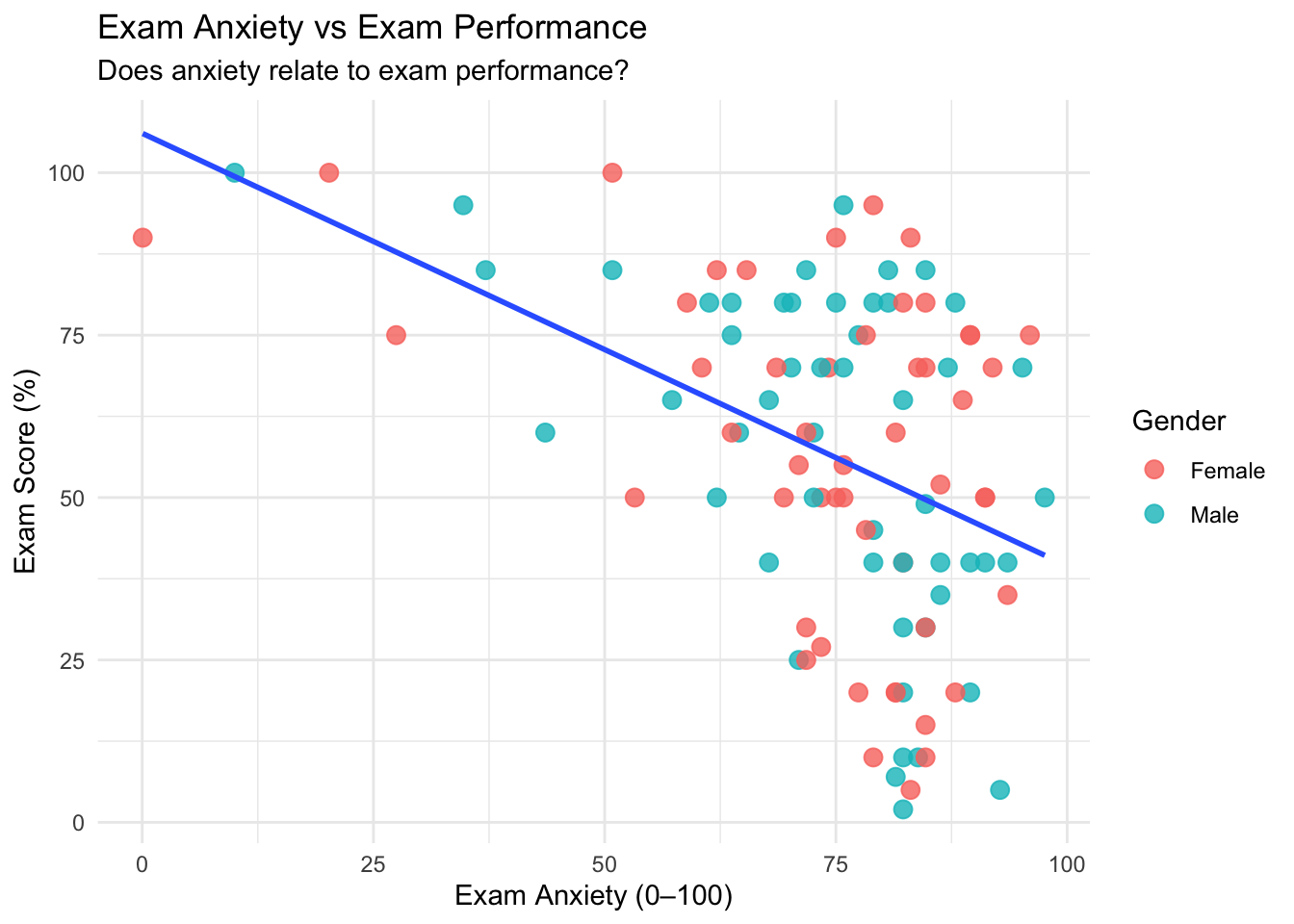 x = "Exam Anxiety (0–100)", y = "Exam Score (%)"