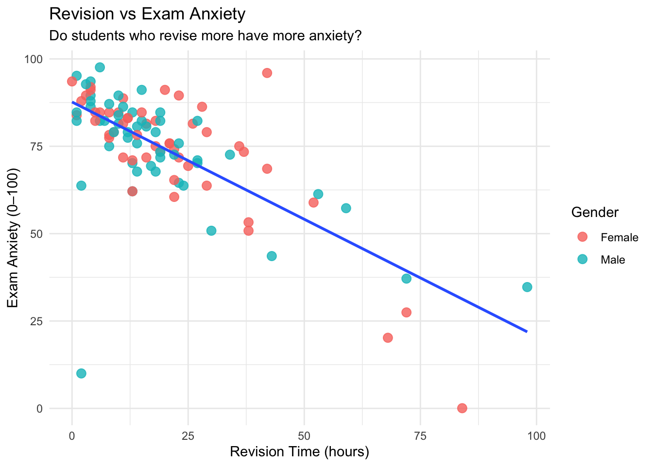 x = "Revision Time (hours)", y = "Exam Anxiety (0–100)"