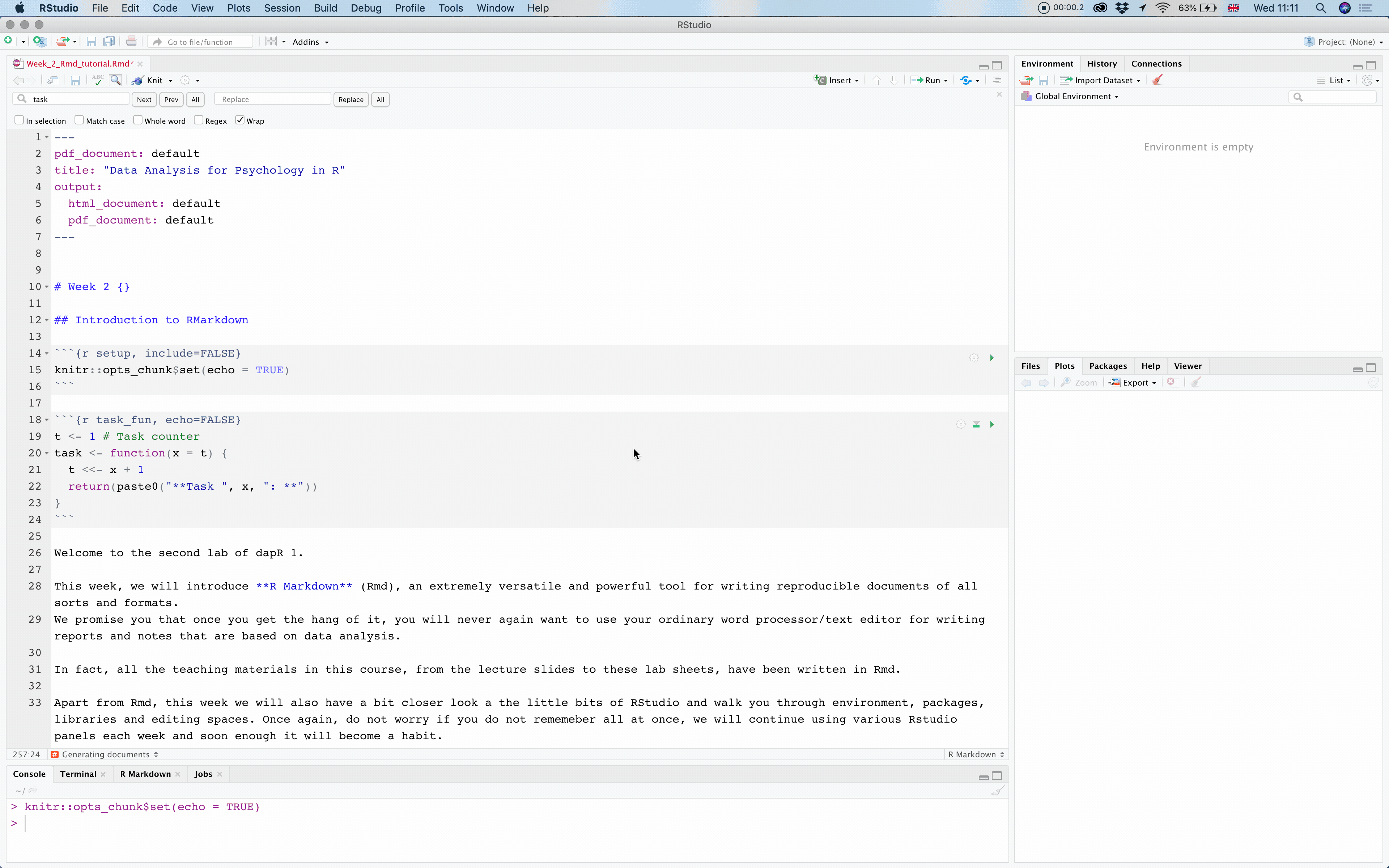 Apart from Rmd, this week we will also have a bit of a closer look at the little bits of RStudio and walk you through environment, packages, libraries and editing spaces. Once again, do not worry if you do not remember everything at once, we will continue using various Rstudio panels each week and soon enough it will become a habit.