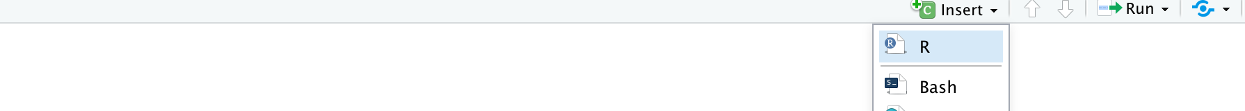 And most importantly, we can include chunks of code which will produce the required output when we compile our document all together. Find a button `insert’ on the top right corner of your Rmd editor. Choose ‘R’.
