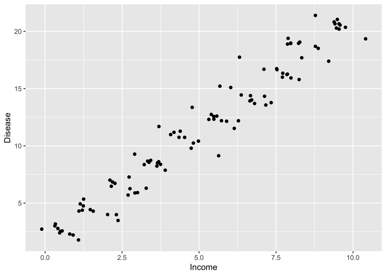 We would like to study the relationship between prevalence of deadly diseases and average income per cities. We will run three models but first let’s provide a simple visualisation of the data: