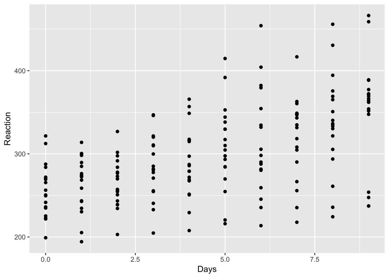 Note: this section is partially adapted from Fox’s Linear Mixed Models and Bates et al (2015) . We will first focus on simple linear model, we extend it to fixed effect model, finally we discuss random effects modelling. We will also use the data from study of Belenky et al (2003). This is pretty famous dataset that is easy to find online and you may find some help on it easily as many people are using it either to teach or to learn about mixed effects.