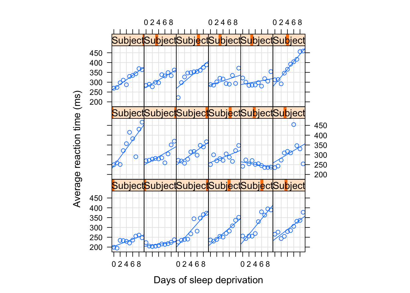 xyplot(Reaction ~ Days|Subject, sleep, type = c("g","p","r"), #we are mixing the types of plots here, try removing the option