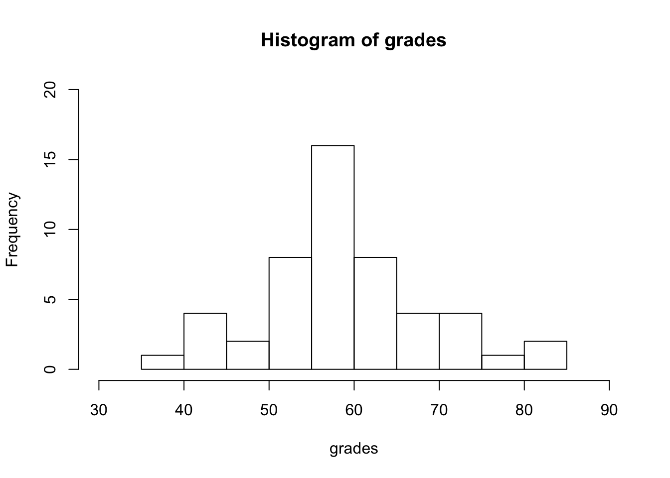 hist(grades, ylim = c(0,20), xlim = c(30,90))