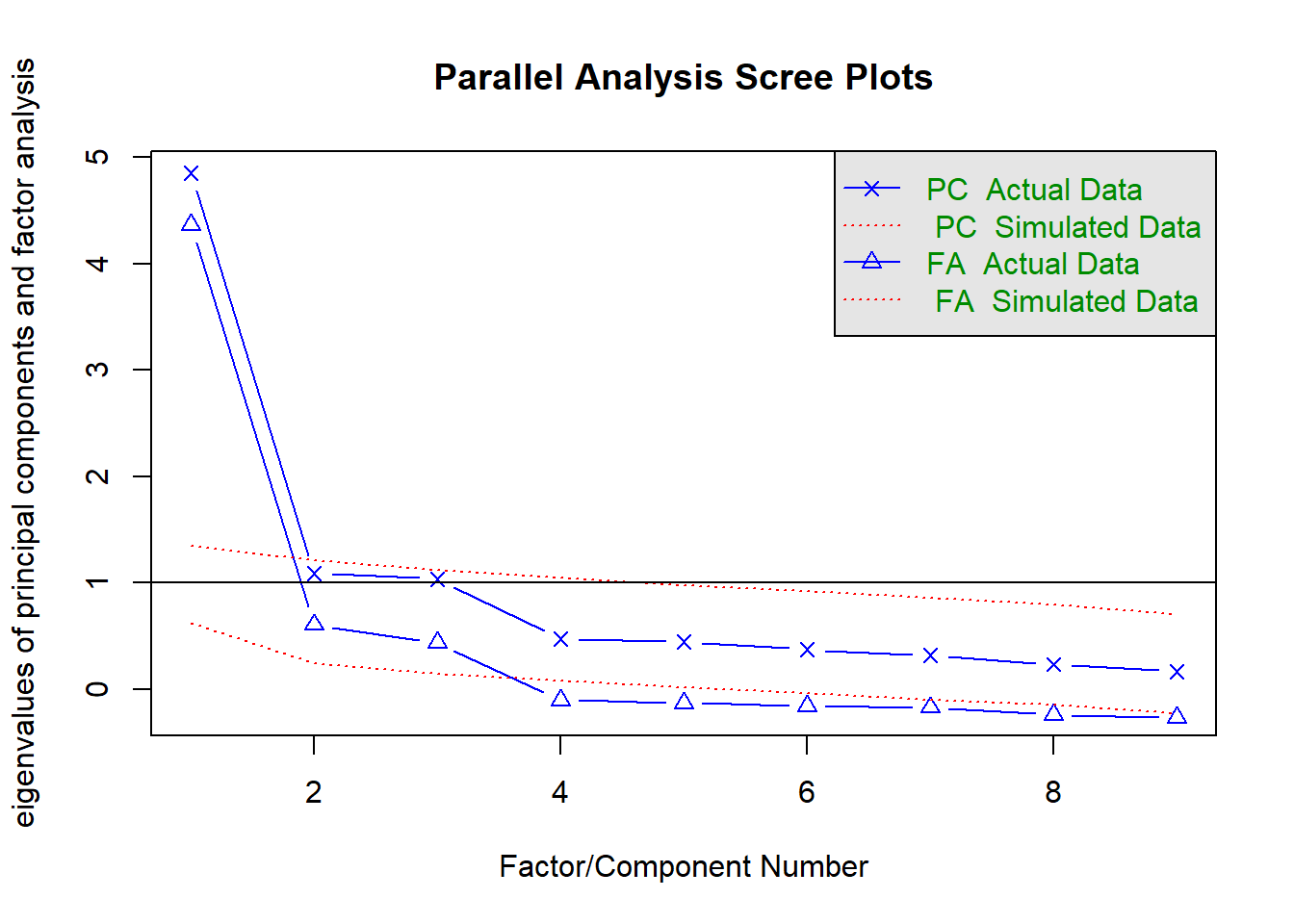 QUESTION 2. Examine the Scree plot. Does it support the hypothesis that 3 factors underlie the data? Why? Does your conclusion correspond to the text output of the parallel analysis function?
