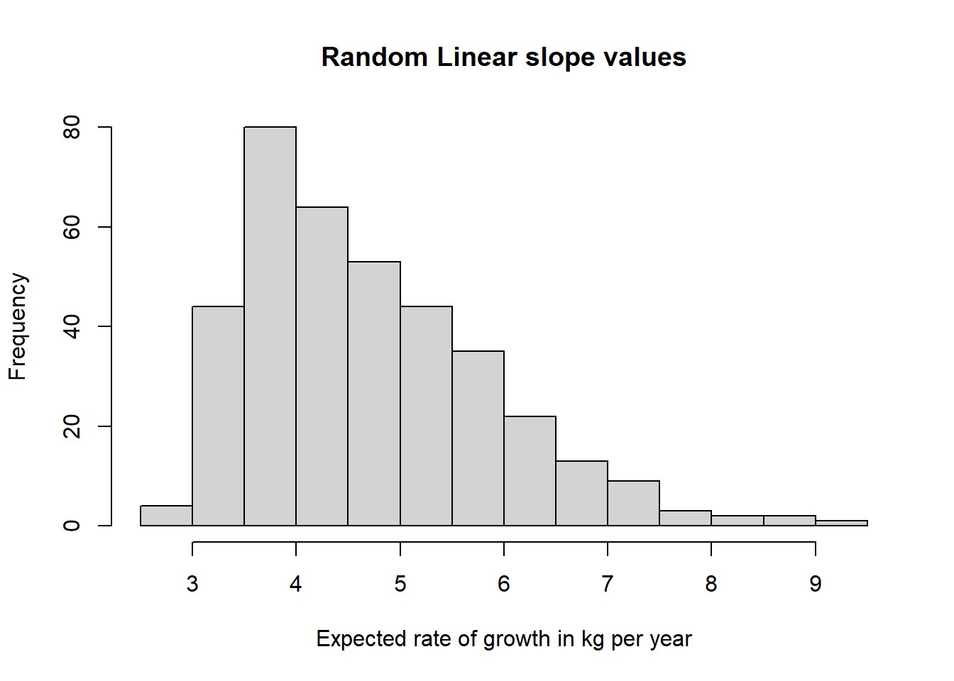 First we note that each trajectory (individual child) can be characterized by its own baseline and rate of increase. For instance, some boys start at below average weight and stay low. Some start average but gain weight quickly. Some start high and gain weight at an average rate. And all combinations of the baseline and growth rate are of course possible.