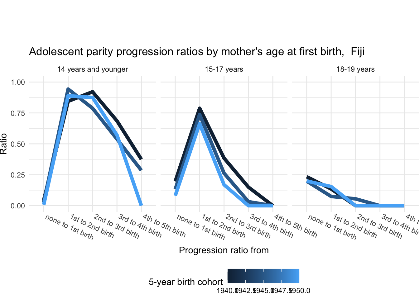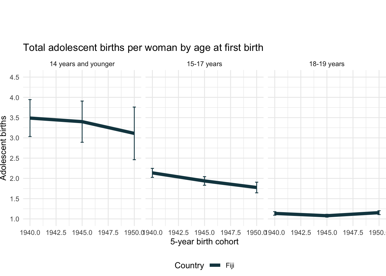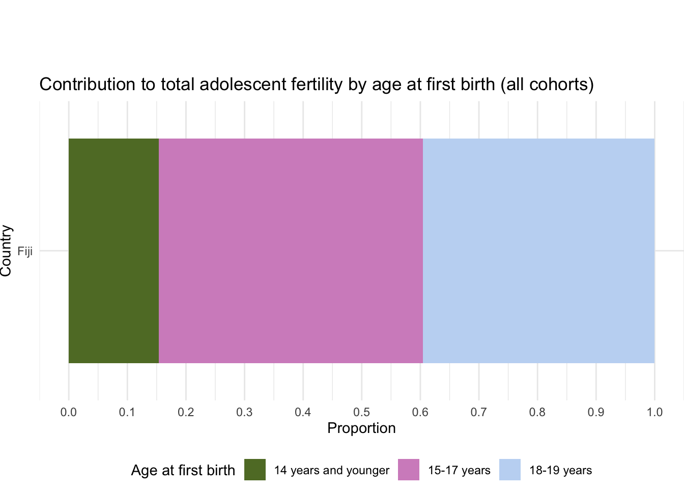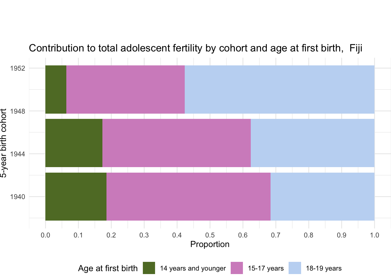 7.1.4 Contribution to total adolescent fertility by age at first birth (all cohorts)