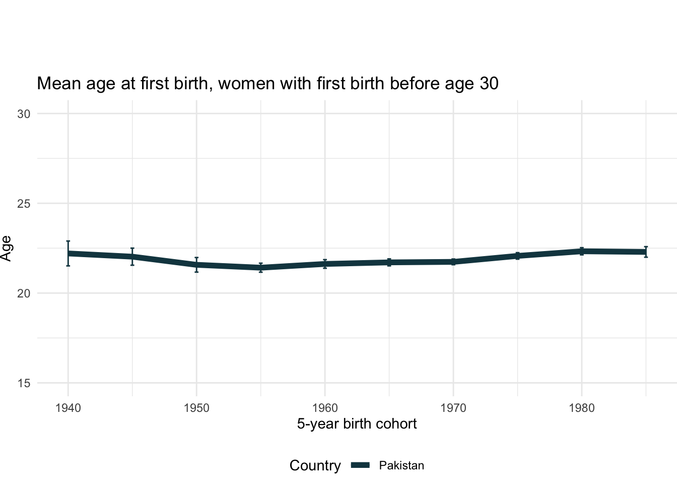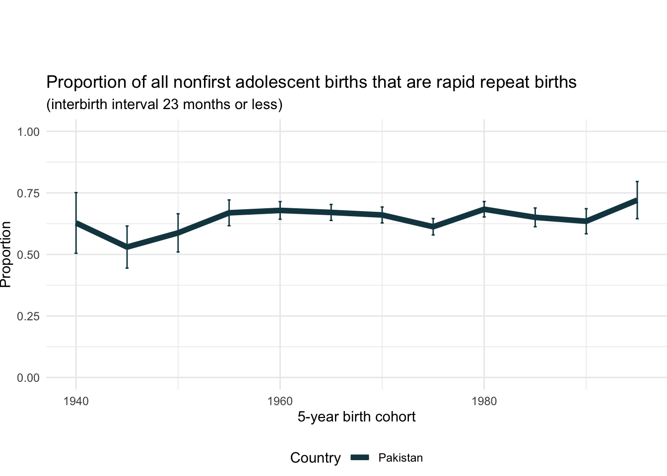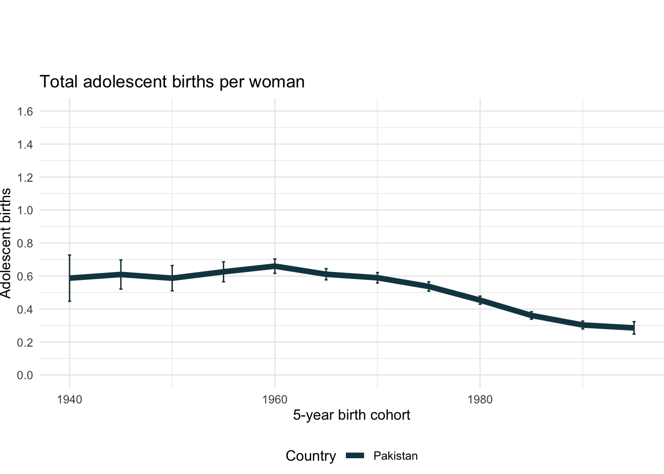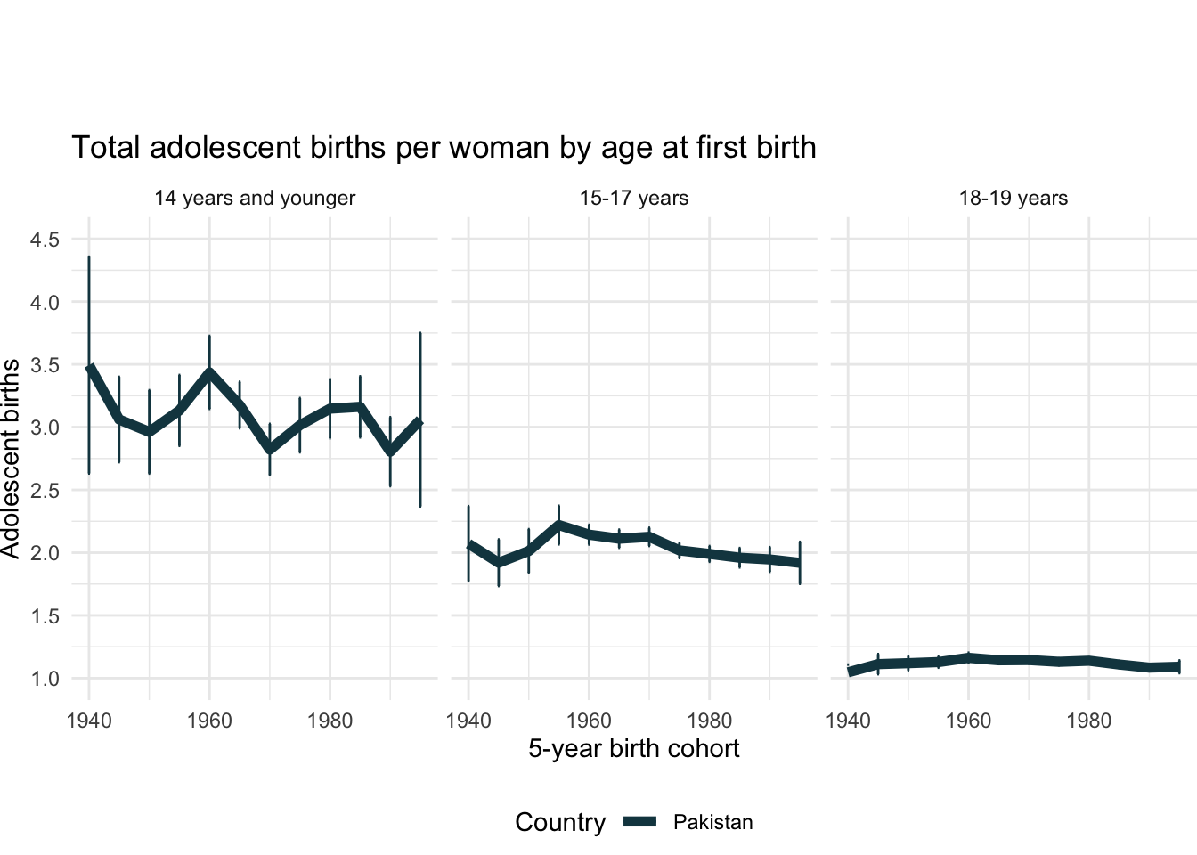 Pakistan 1990, 2006, 2012, and 2017 DHS surveys ask birth history questions only of ever-married women. The estimates below consider all women aged 20-49 at the time of the survey, not just ever-married women, but in so doing assume that never-married women from the DHS surveys have never given birth.