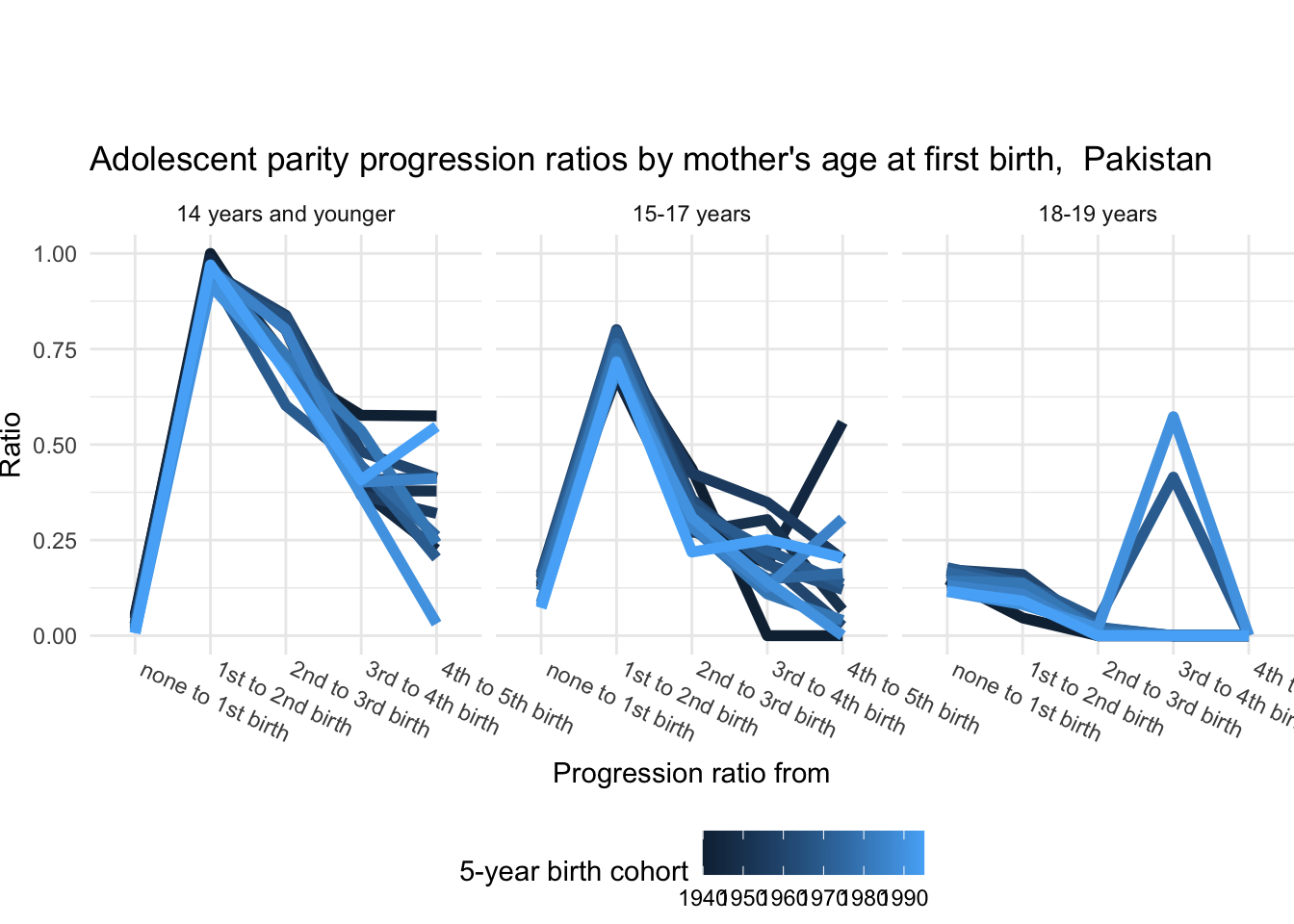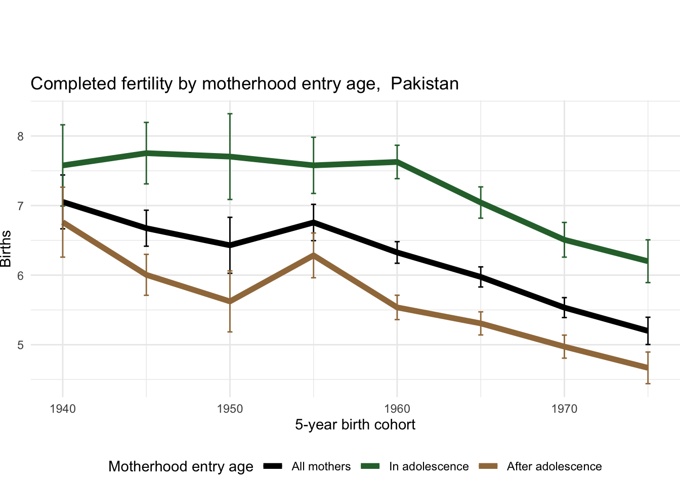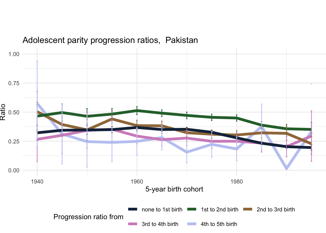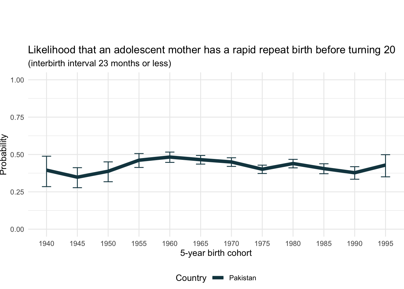 Pakistan 1990, 2006, 2012, and 2017 DHS surveys ask birth history questions only of ever-married women. The estimates below consider all women aged 20-49 at the time of the survey, not just ever-married women, but in so doing assume that never-married women from the DHS surveys have never given birth.