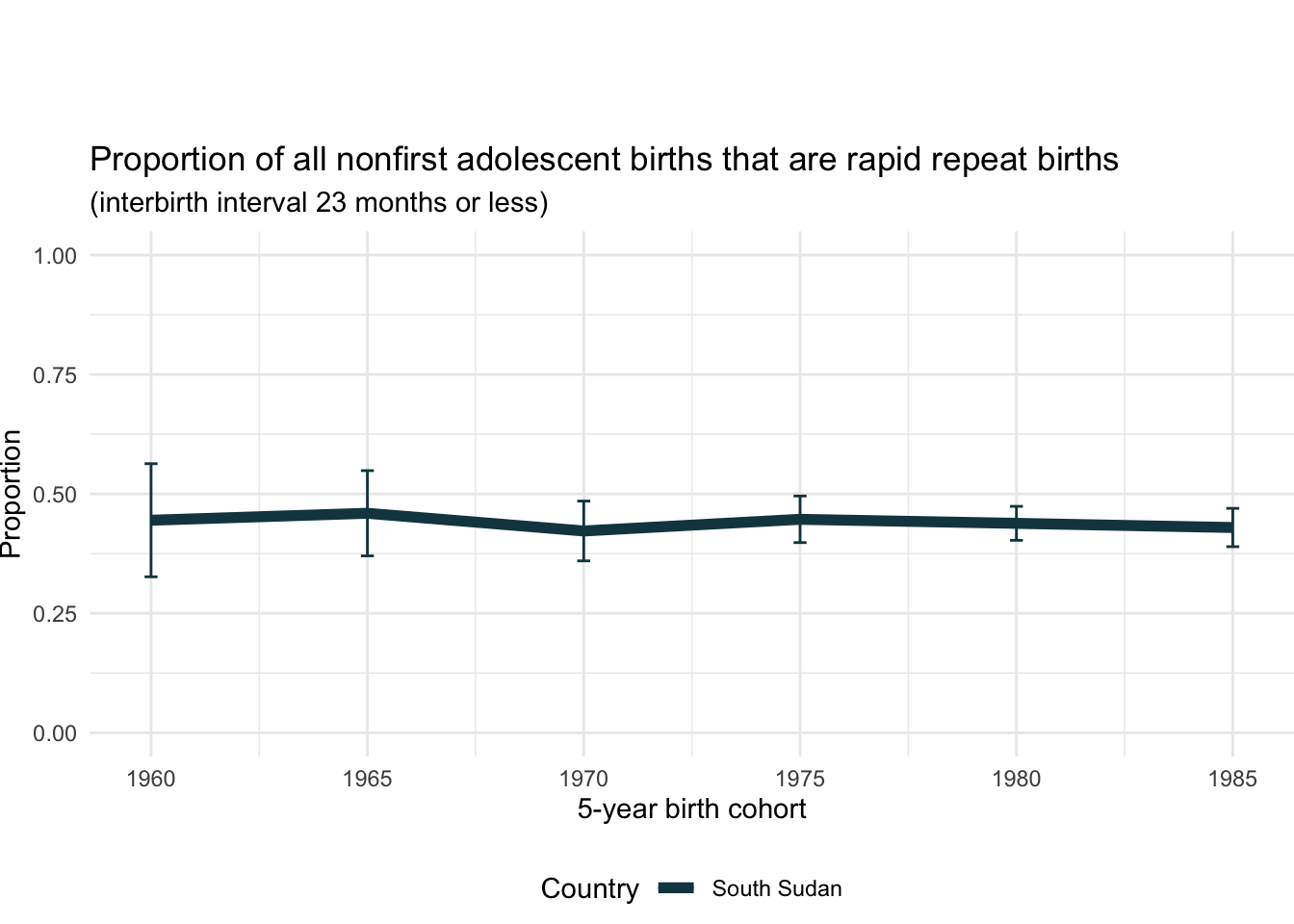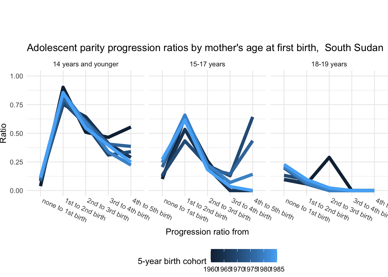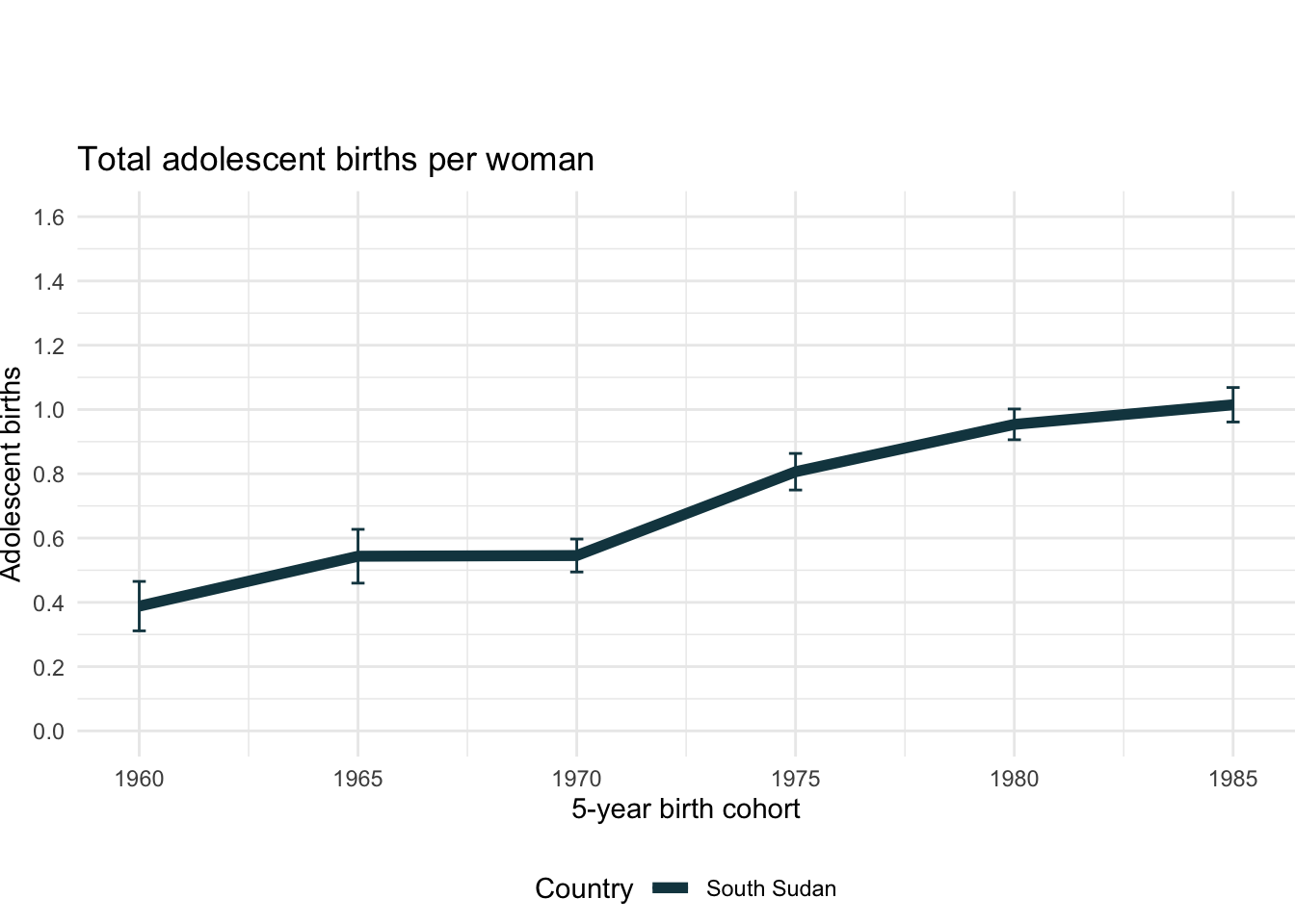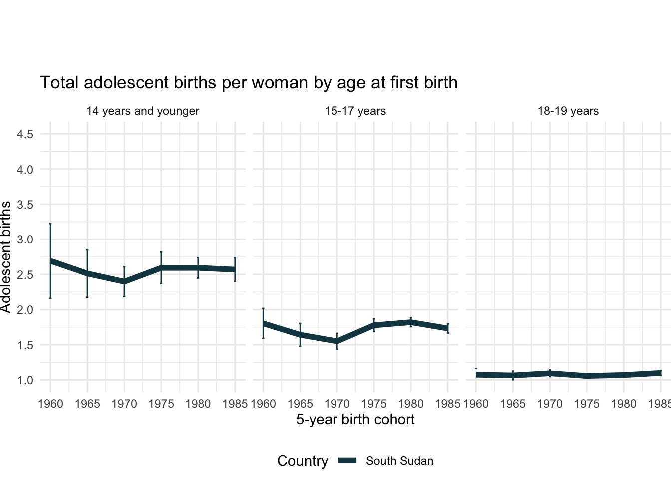 Caution: South Sudan 2010 MICS Survey. Half of women in dataset have a missing date of birth, which means they could not be included in the data analysis and therefore the estimates are unlikely to be representative. Given that women who are the least educated are the most likely to be unable to give a date of birth, and are also most likely to have the earliest and most adolescent births, the estimates probably undercount adolescent fertility in the country. Also more likely that the older women with least education and most adolescent fertility are unable to give their date of birth, which could contribute to lower adolescent fertility in earliest cohorts compared to more recent cohorts.