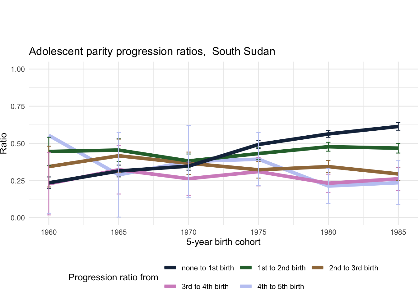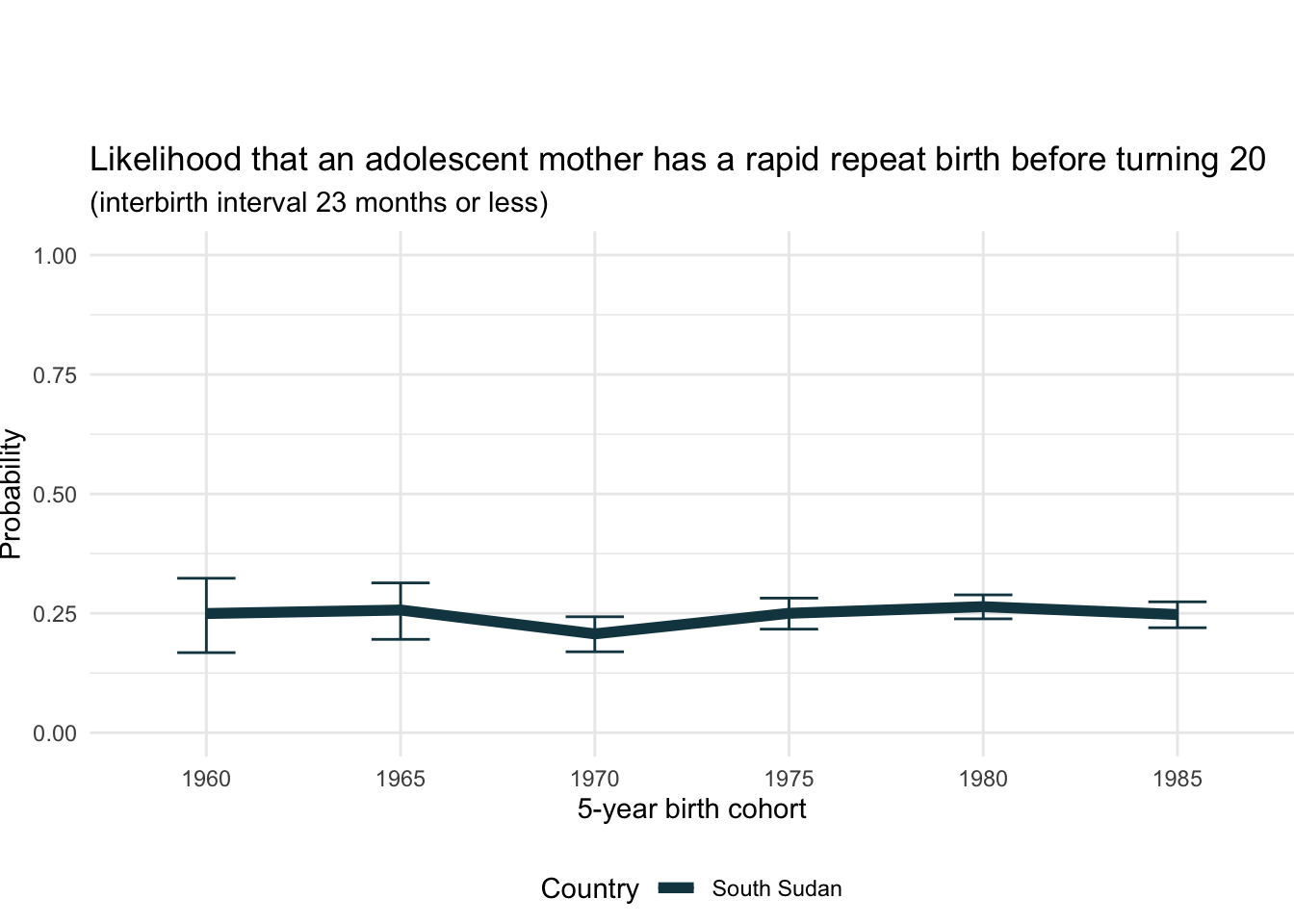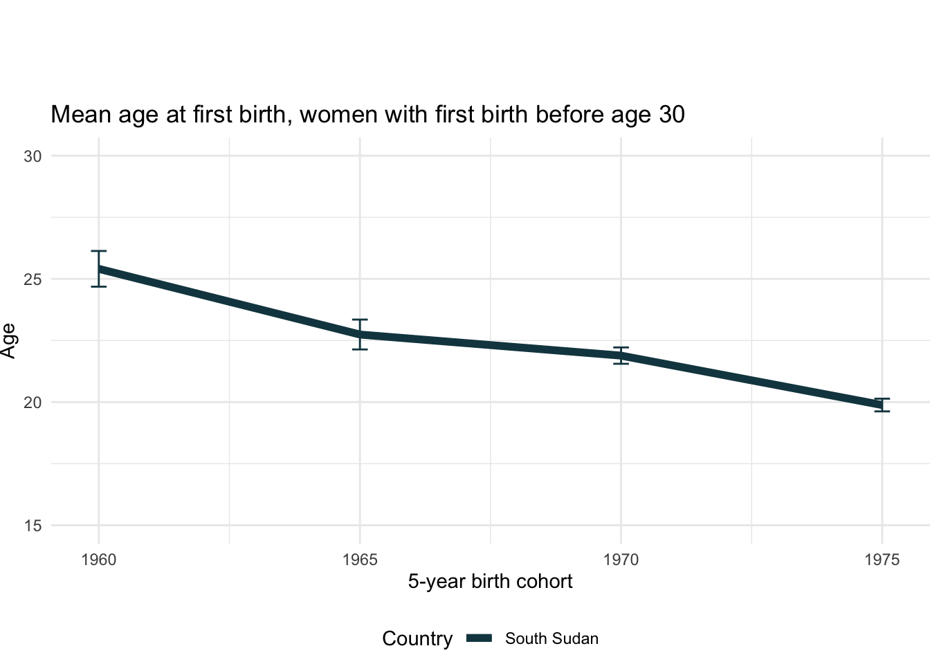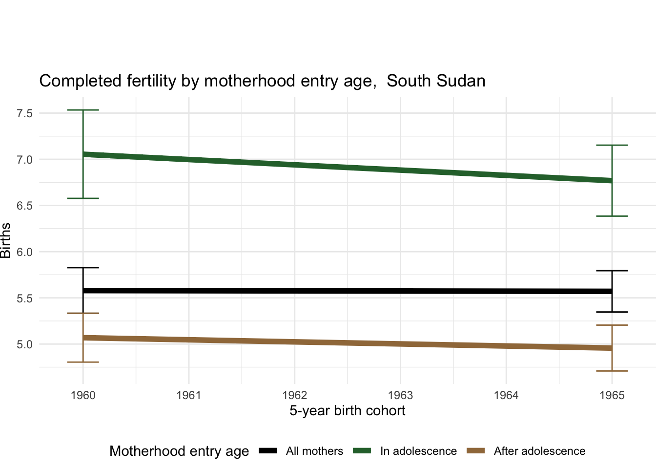 Caution: South Sudan 2010 MICS Survey. Half of women in dataset have a missing date of birth, which means they could not be included in the data analysis and therefore the estimates are unlikely to be representative. Given that women who are the least educated are the most likely to be unable to give a date of birth, and are also most likely to have the earliest and most adolescent births, the estimates probably undercount adolescent fertility in the country. Also more likely that the older women with least education and most adolescent fertility are unable to give their date of birth, which could contribute to lower adolescent fertility in earliest cohorts compared to more recent cohorts.