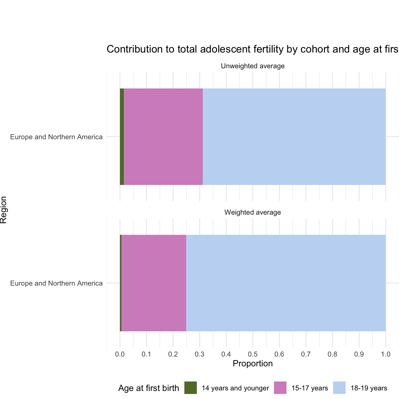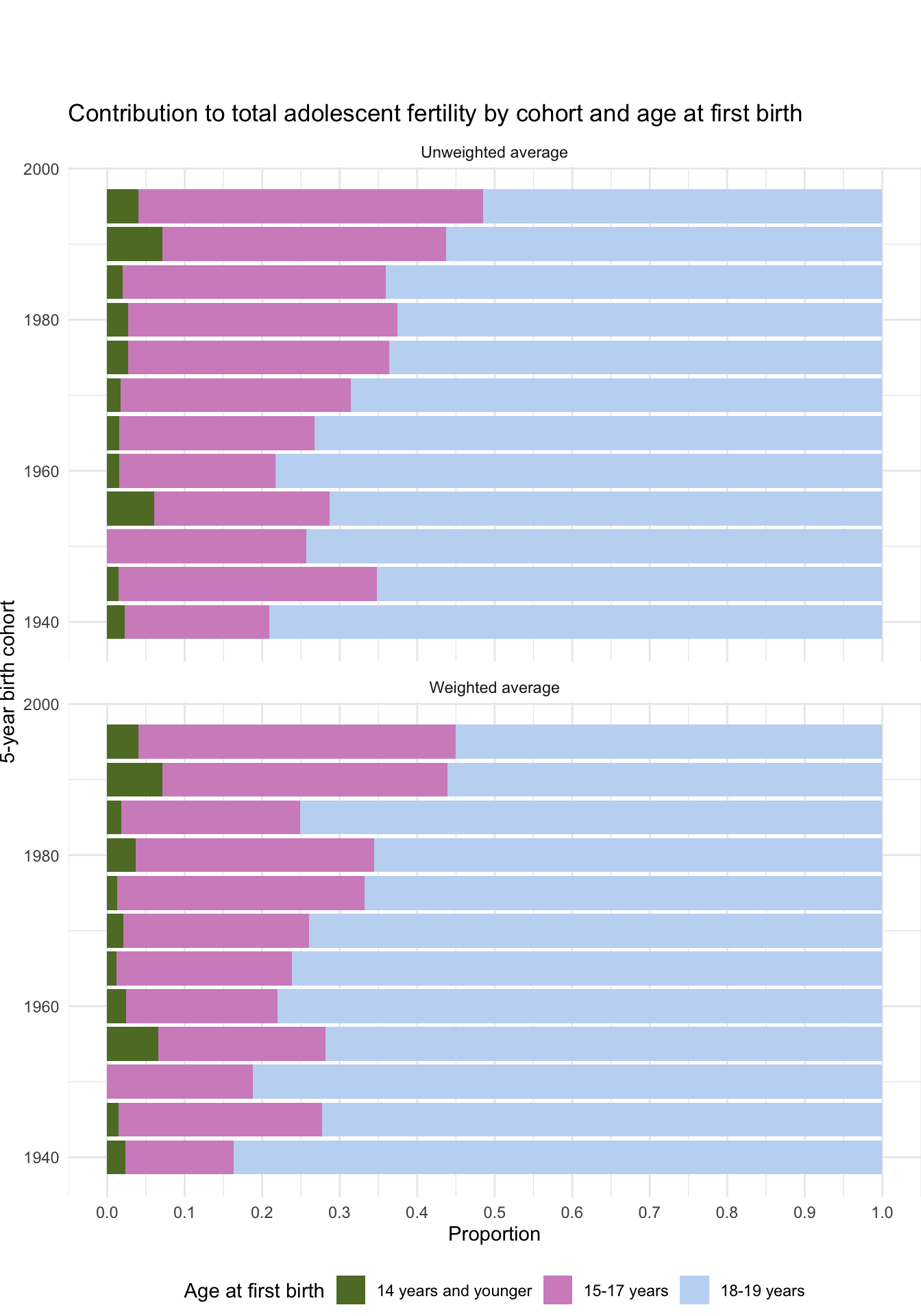 8.11.4 Contribution to total adolescent fertility by age at first birth (all cohorts)