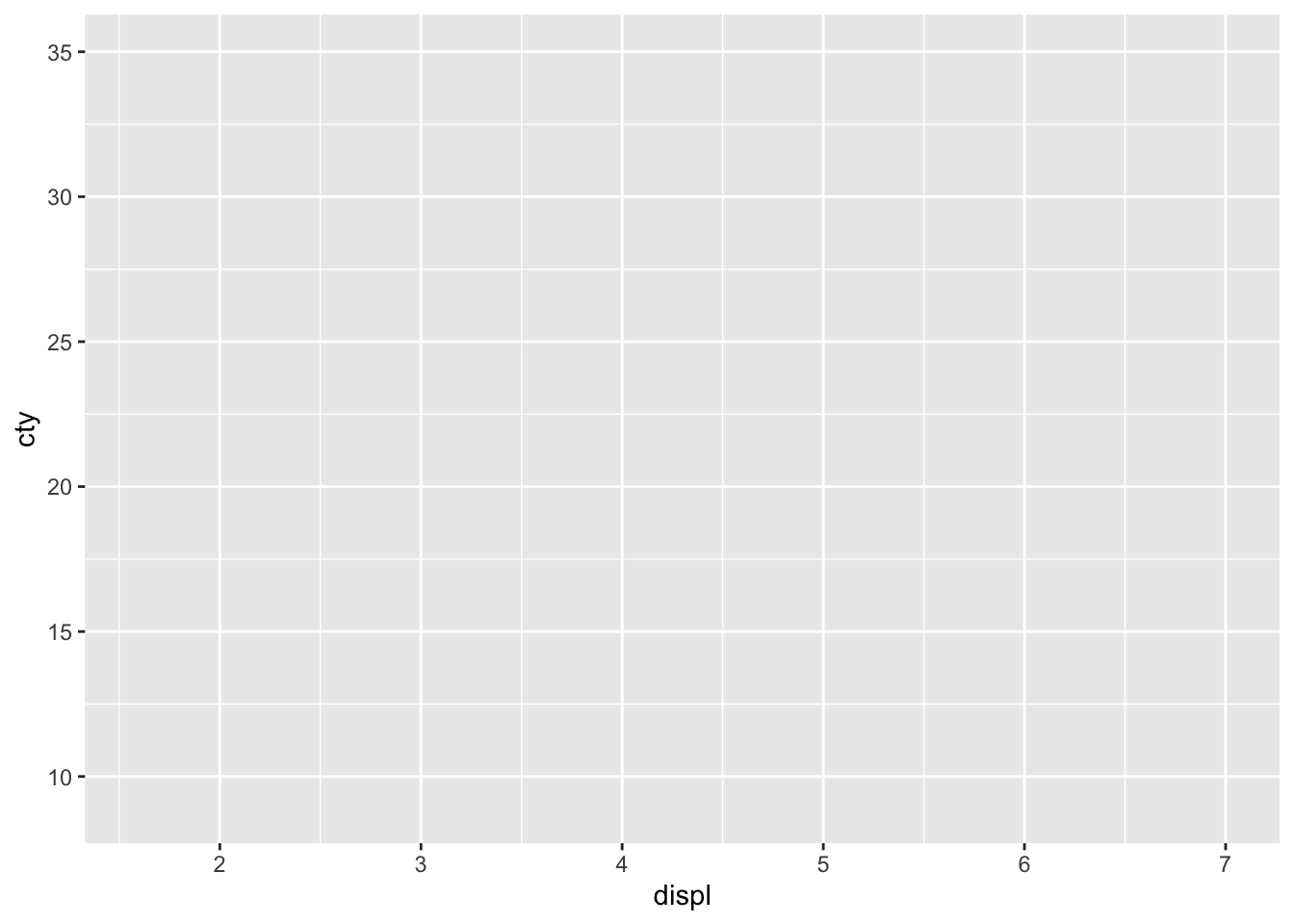 Running this command will produce an empty grey panel. This is because we need to specify how different columns of the data frame should be represented in the plot.