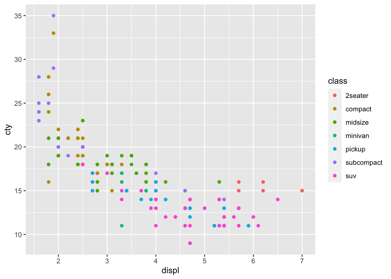 Here, we aim to produce a scatter plot of the engine volume (‘displacement’) vs fuel efficiency/mileage in the city (‘cty’), for each class of vehicle. The points on the plot will be coloured based on the vehicle class (right-most column).