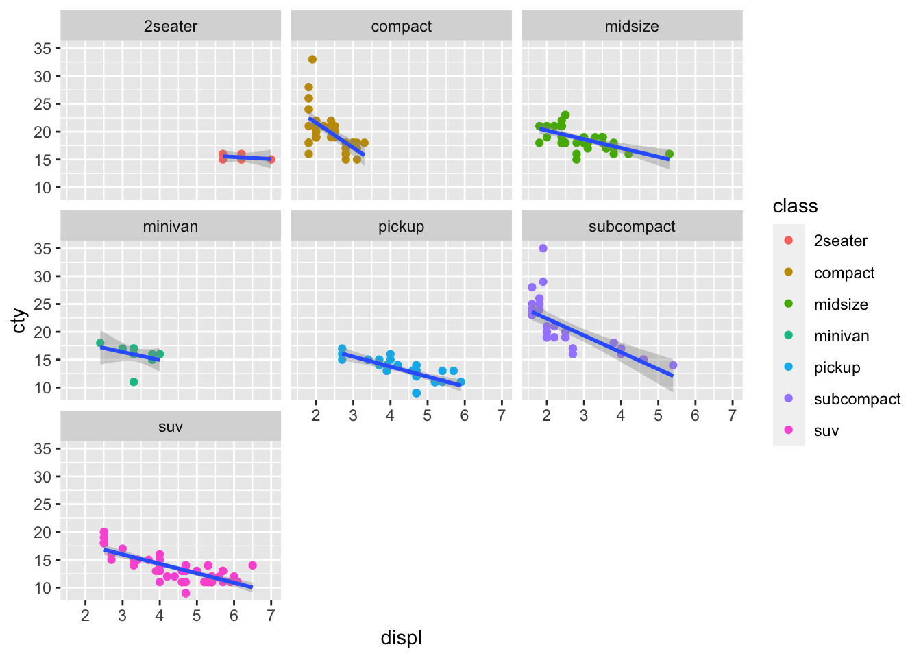 facet_wrap( ~ class)## `geom_smooth()` using formula 'y ~ x'