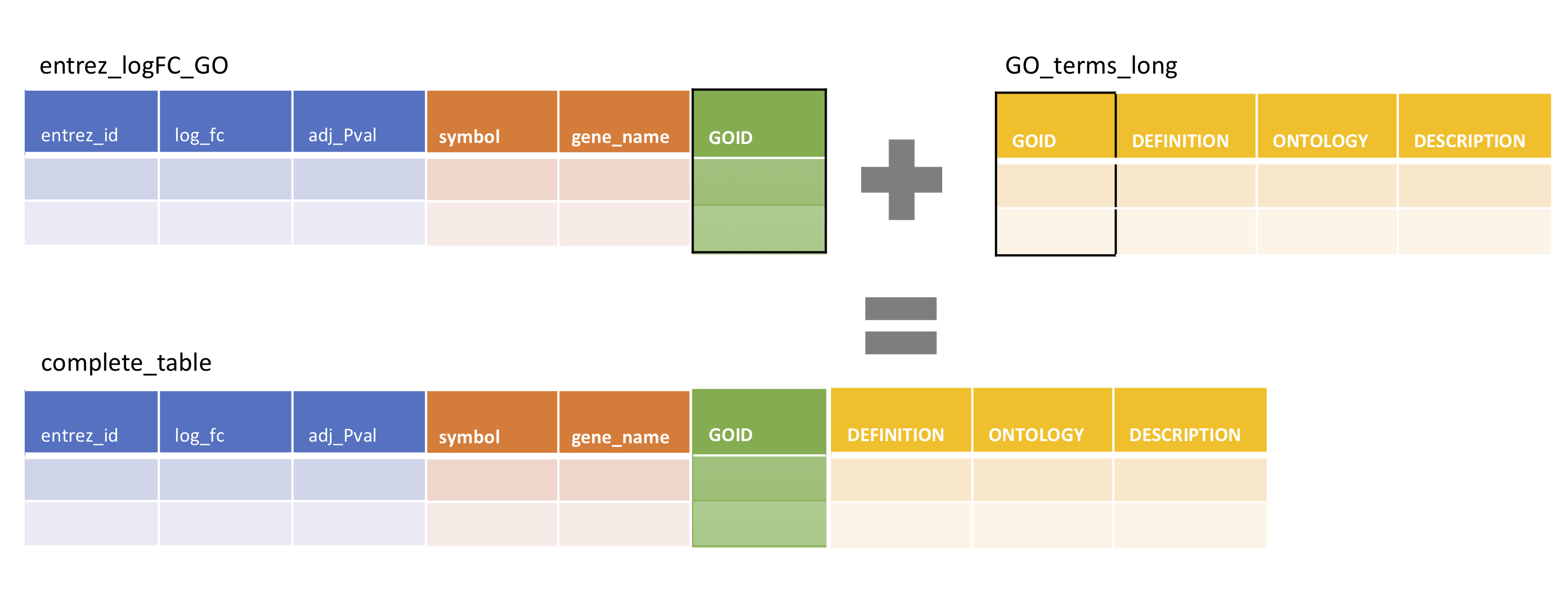 entrez_logFC_GO <- entrez_logFC_annot %>% left_join(GO_entrez_long, by = 'entrez_id')Finally, we will create a variable ‘complete_table’ by joining in the GO term descriptions in GO_terms_long. This time, the joint key will be the ‘GOID’ column