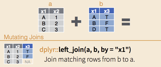 The output of left_join(), will contain the entire left-side dataframe (‘a’), and the additional columns from ‘b’ populated with values for all rows where the joint key is matching. NA will appear in cells for which there is no match in ‘b’.