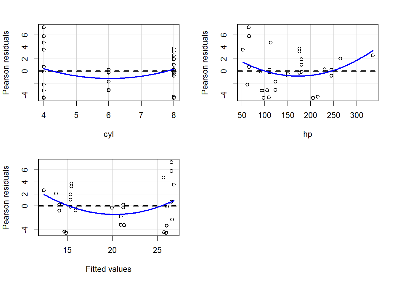 residualPlots()function and how it works in: Chapter 6, Section 6.2.1 “PLOTTING RESIDUALS” (specifically pp. 288-290) of: Fox, J., & Weisberg, S. (2018). An R companion to applied regression. Sage publications. – The relevant chapter may be available here: https://www.sagepub.com/sites/default/files/upm-binaries/38503_Chapter6.pdf.↩︎For many statistical tests, we use a threshold of p < 0.05 to determine if the test is significant or not. However, for this test of linearity and fit, I recommend that you do not keep a specific threshold in mind. You need to look visually at the plots produced, alongside the p-value for the test result. Then, you can make a fully informed decision about whether to change how you specify the model or not.↩︎