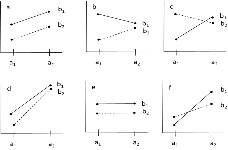 Task 7: The six figures below show the population means for six experiments. For each one, indicate whether an A effect, a B effect, and/or an AxB interaction is present (in some figures, more than one of these effects are present).