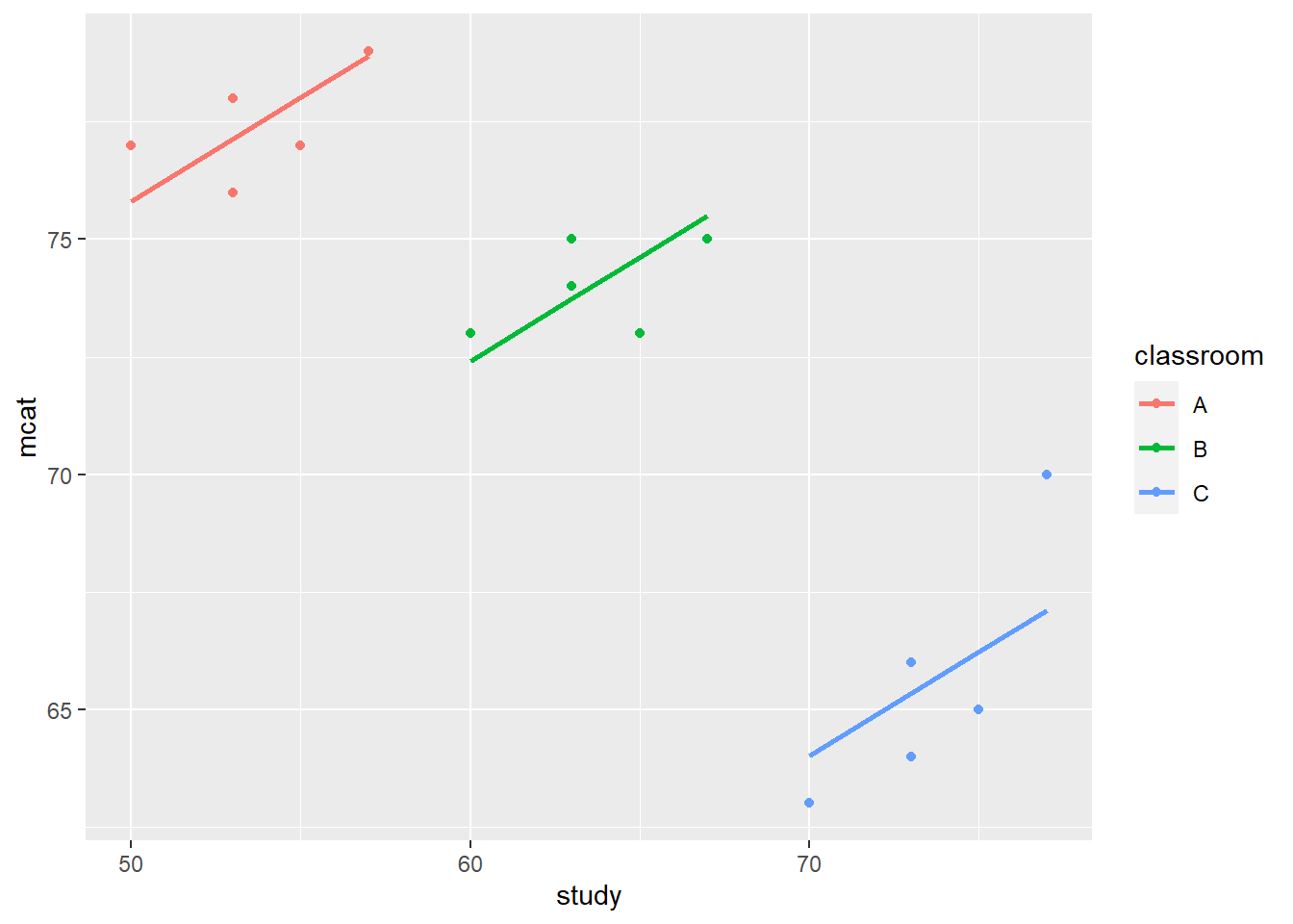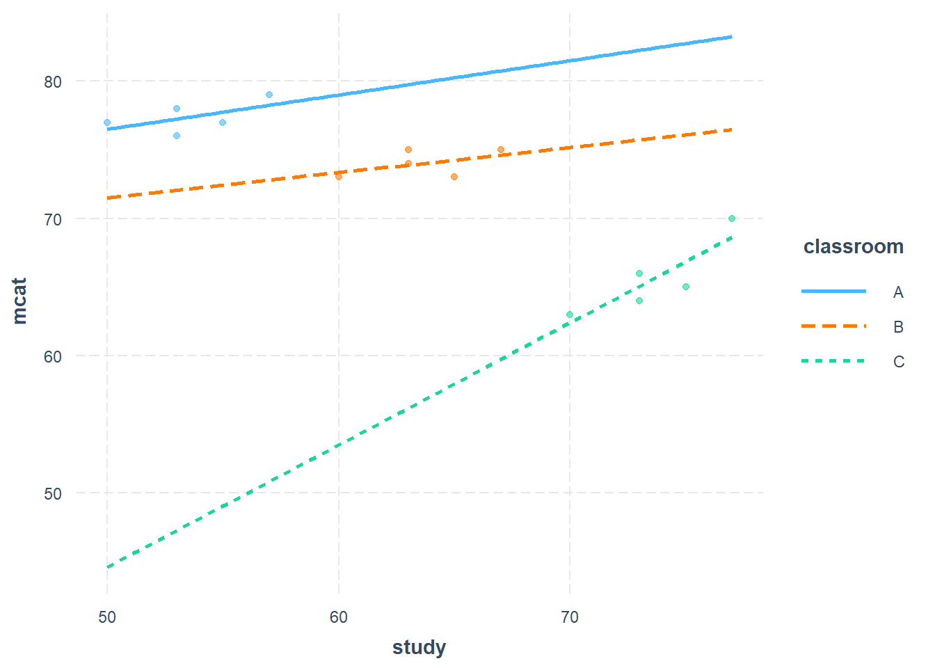 As you can see above, the data from the three classrooms are not overlapping much or at all. This is another good indicator that we need to be looking at our outcome of interest—MCAT score percentile—at the group level rather than just in our overall sample.