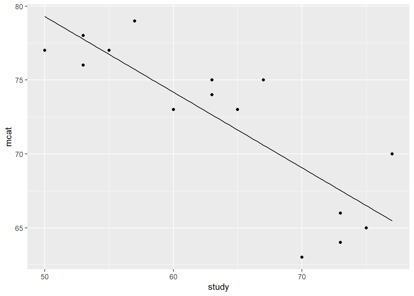 Above, we loaded the dplyr and ggplot2 packages. We then created an empty plot called p in which the y-axis is mcat and the x-axis is study. We then added points to this empty plot to make the scatterplot that we wanted to see. It is not required for you to understand all of the code above. To use this code to make your own scatterplot, replace study with your independent variable and replace mcat with your dependent variable.