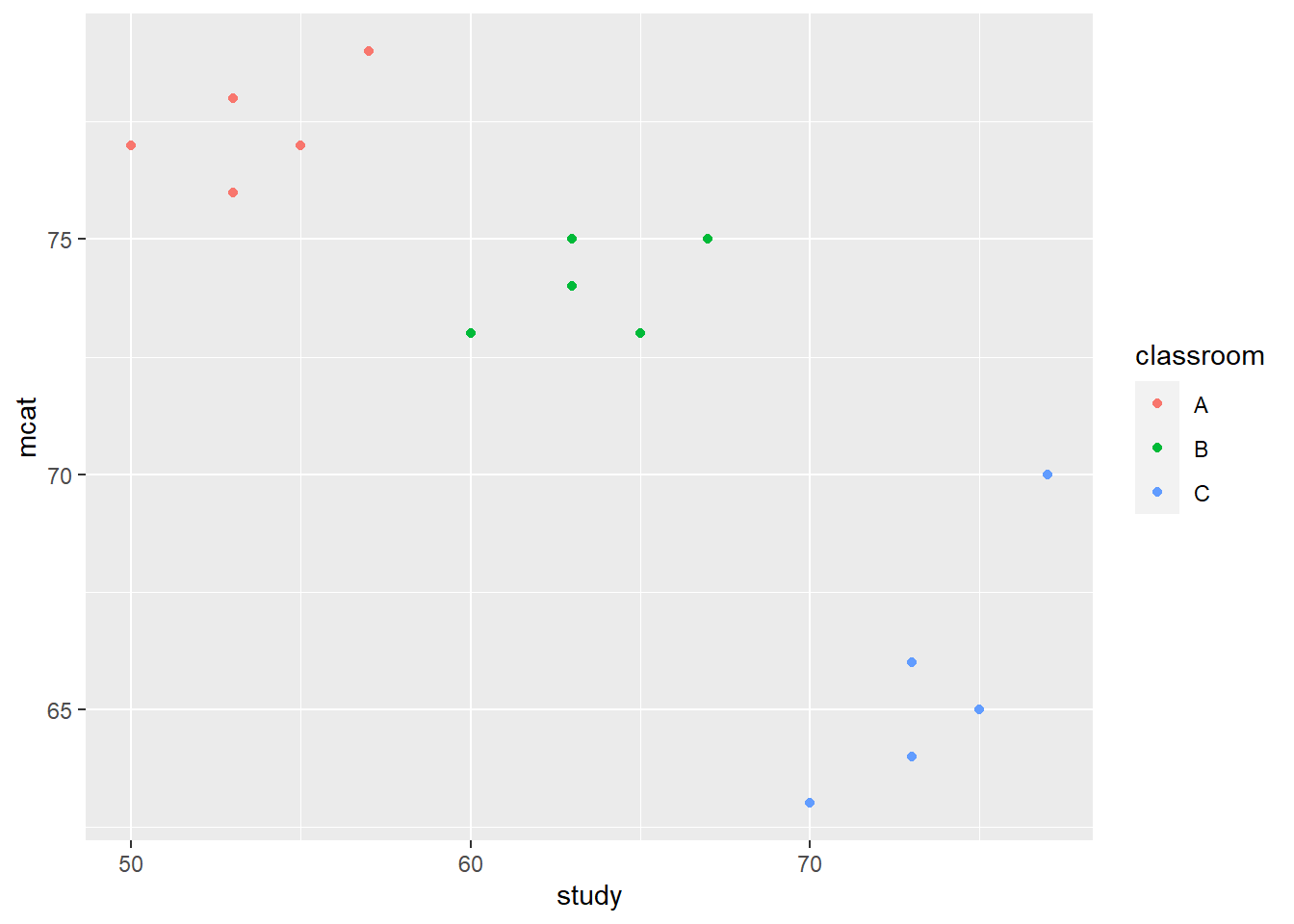 Above, we used the same code we did earlier to make a scatterplot, but additionally, we assigned a color to members of each classroom (the computer selected the colors on its own). It is not required for you to understand all of this code. To use this code to make your own scatterplot with colored groups, replace classroom with the name of your grouping variable.