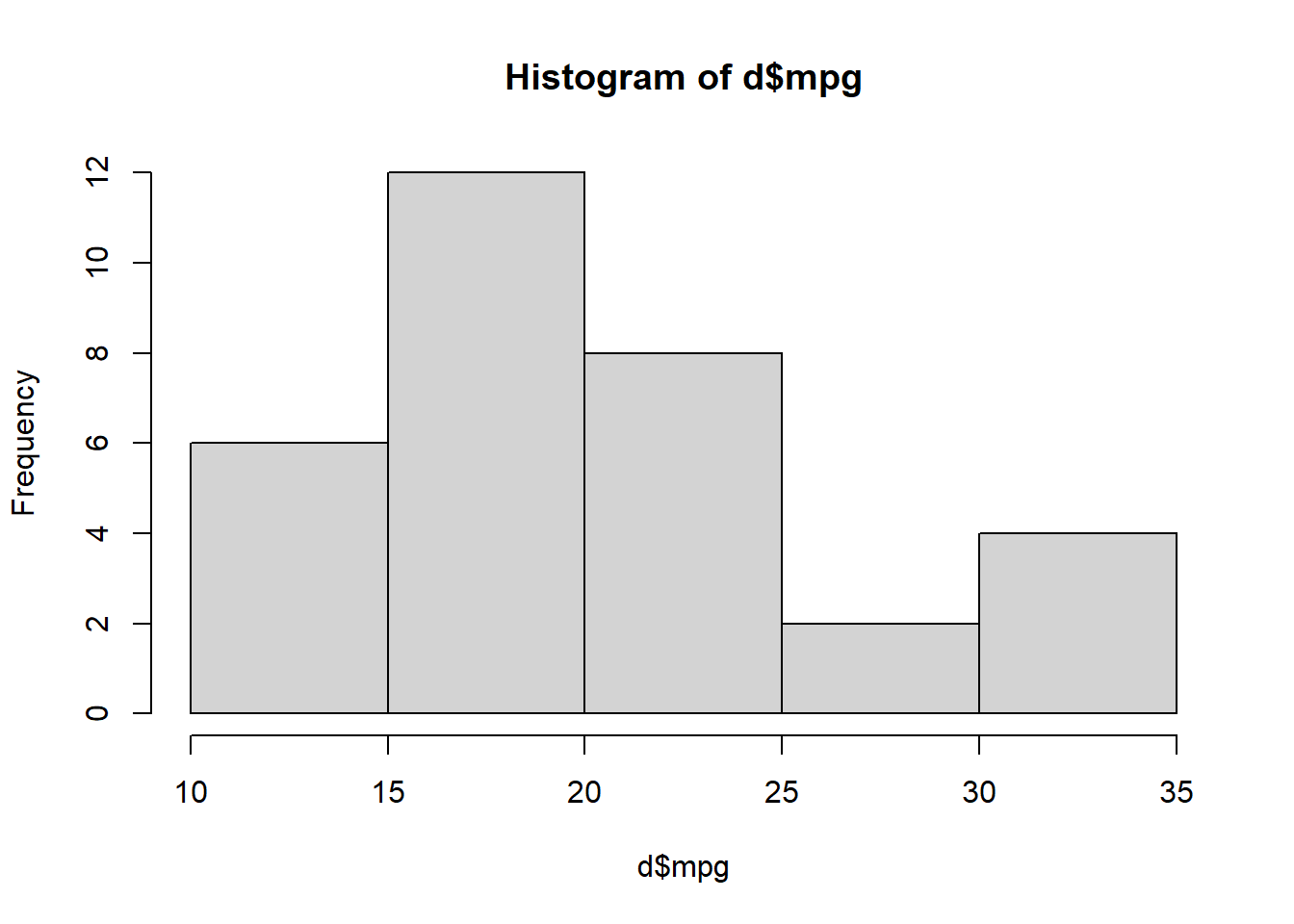 Task 20: Run the command hist(d$mpg) (again, make sure you’re adding the command in a new line of your code file). You should then see a histogram in RStudio.