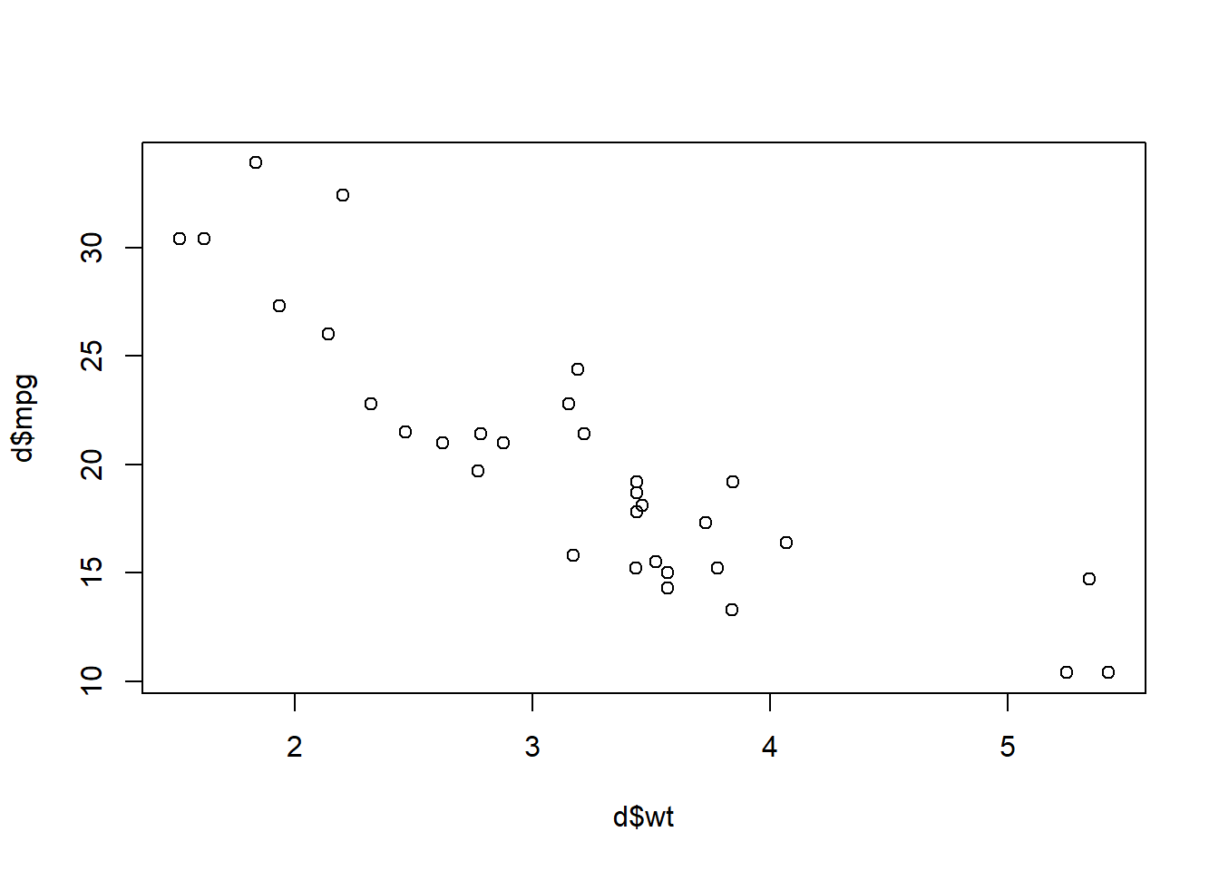 Task 21: And now let’s make a scatterplot using plot(d$wt,d$mpg).