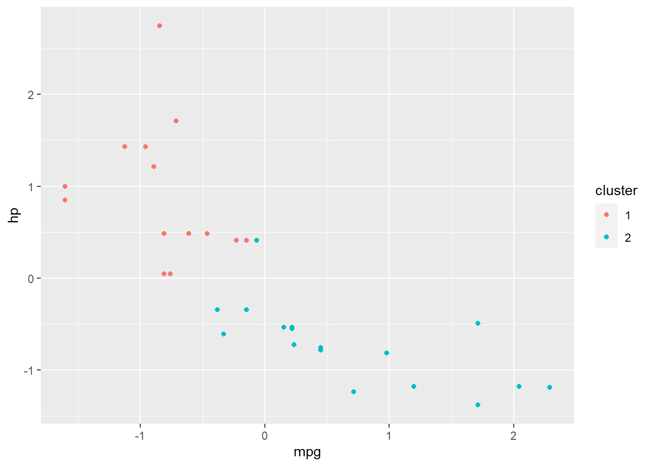 In the two plots above, we see that observations (cars, in this case) have fairly different mpg measurements when comparing clusters 1 and 2 (the only two clusters). But the carb measurements are not as different when comparing the two clusters. Box plots are a convenient way to quickly look across groups (clusters, in this case) within your data.