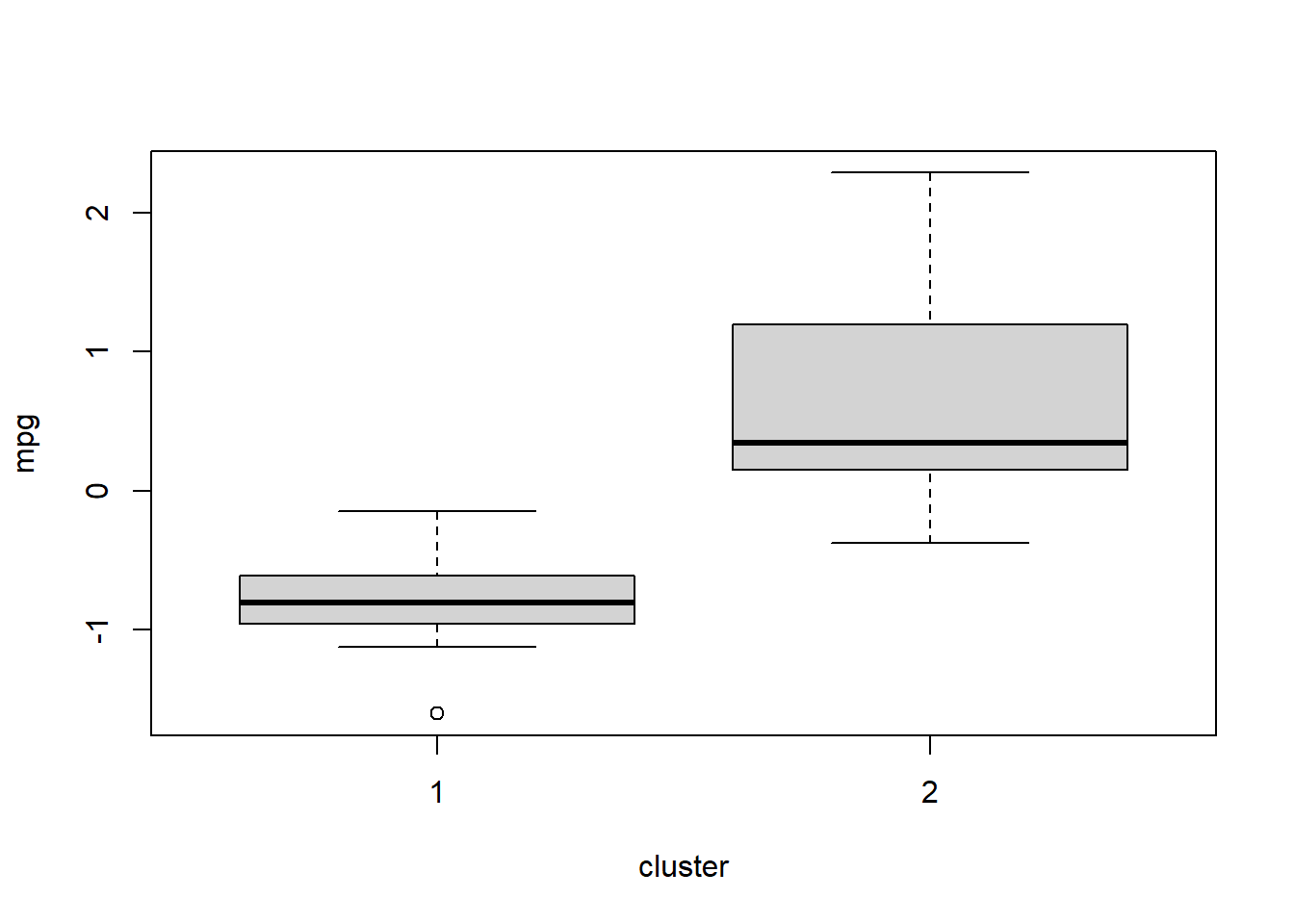 boxplot(mpg ~ cluster, data = df)