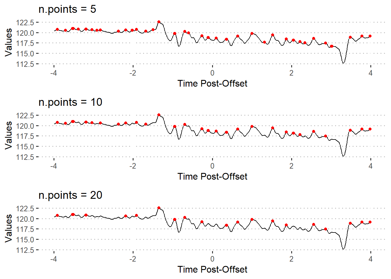 pks20 <- find_peaks(xvals = df$Trial8, n.points = 20)n.points = 5returns the indices for 44 peaksn.points = 10returns the indices for 34 peaksn.points = 20returns the indices for 23 peaks