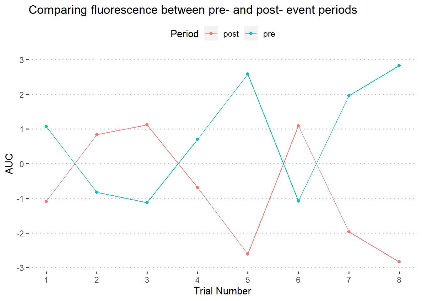 fluoR includes the function auc.pre to quickly calculate the AUC for a range of trials during a specified period of time. As an example of how this can be used, let’s compare full pre-trial and post-trial periods for trials 1-4.
