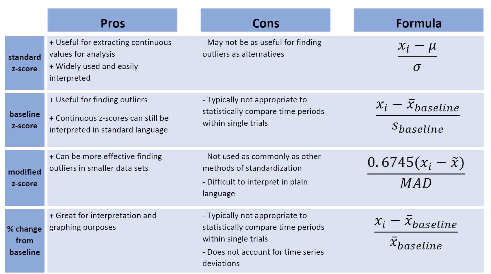 \[\begin{gather*} baseline \ z_{i} = \frac{x_{i}-\bar{x}_{baseline}}{s_{baseline}} \end{gather*}\] \[\begin{align*} \text{where...} \\ \bar{x}_{baseline} &= \text{mean of values from baseline period,} \\ {s}_{baseline} &= \text{standard deviation of values from baseline period} \\ \end{align*}\]