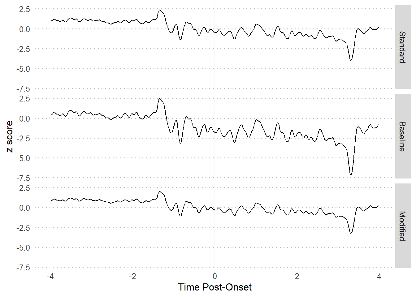 This results in a time series interpreted in terms of standard deviations and mean during the baseline period. Baseline z-scores are conceptually justifiable because the standard deviation is then the number of deviations from the mean when a subject is at rest. The values outside of the baseline period will be different using this version, but not within the baseline period.