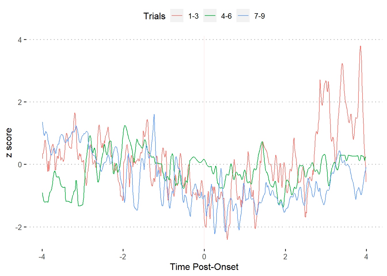 Let’s say that you have 30 trials. As part of your hypothesis, you believe that neural activity will change shortly after exposure to a stimulus during trials 1-10, but not subsequent ones.