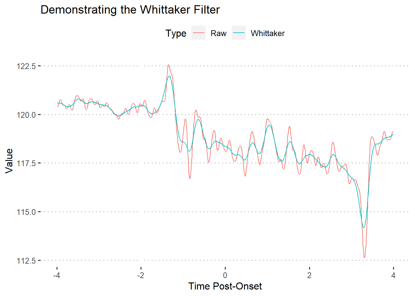 As shown by the above figure, the Whittaker filter produces a much more “tame” line. In turn, the line makes extreme values (peaks and valleys) smaller. This filter tends to be useful when trying to smooth data without flattening too many curves.