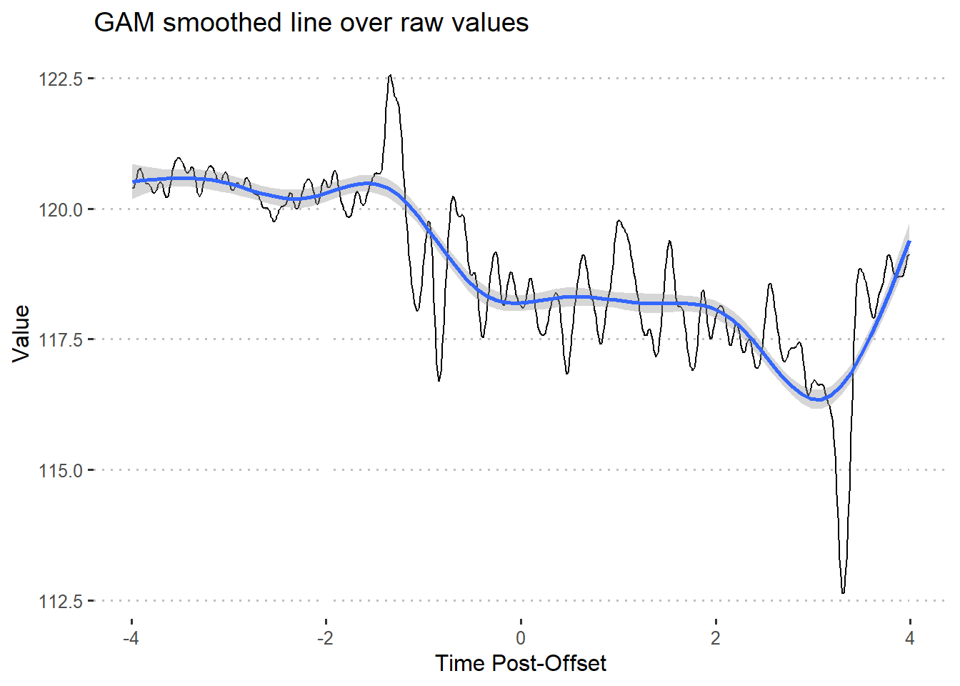 The mgcv R package includes a popular implementation of GAM’s. The formula input for the package’s gam function is styled like R’s base glm function. To smooth our time series data, we use Time as the dependent variable and our observation values as the independent variable.
